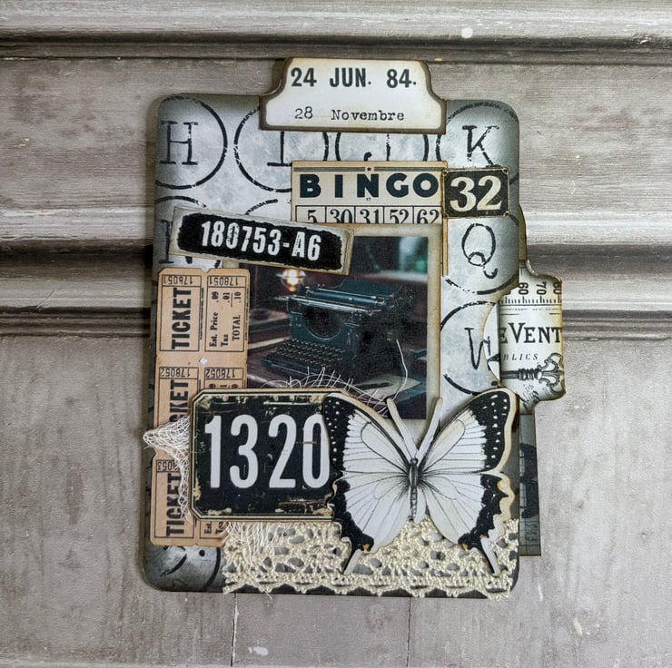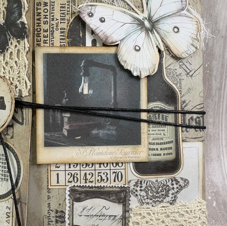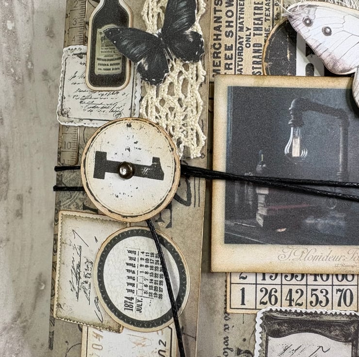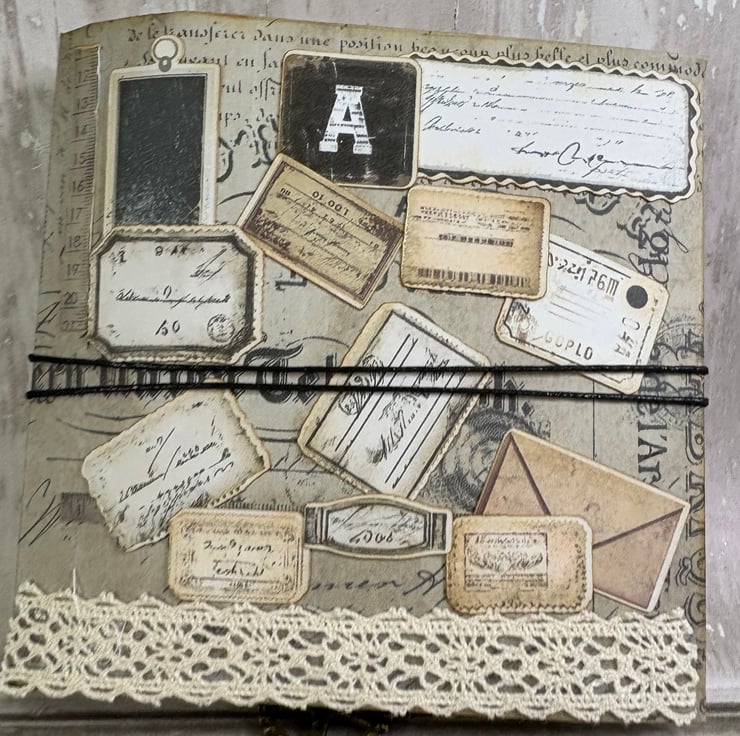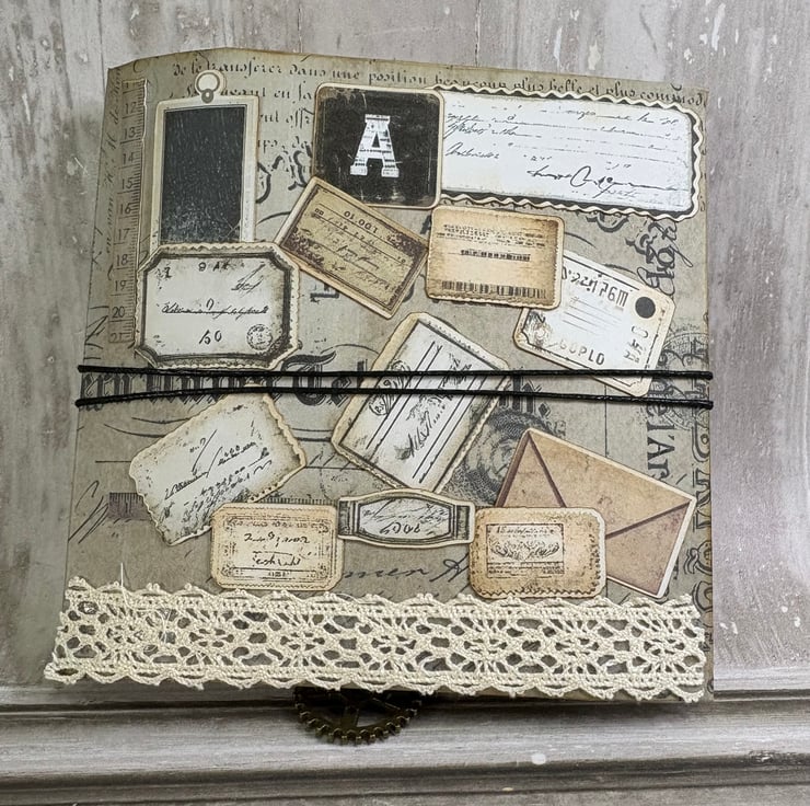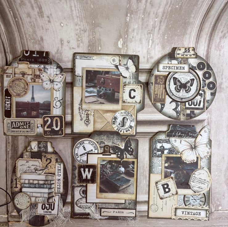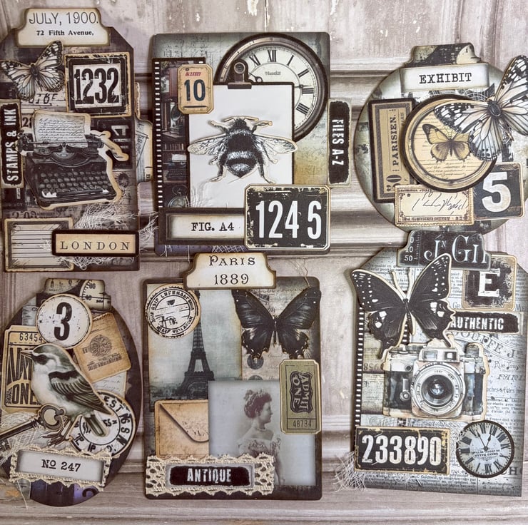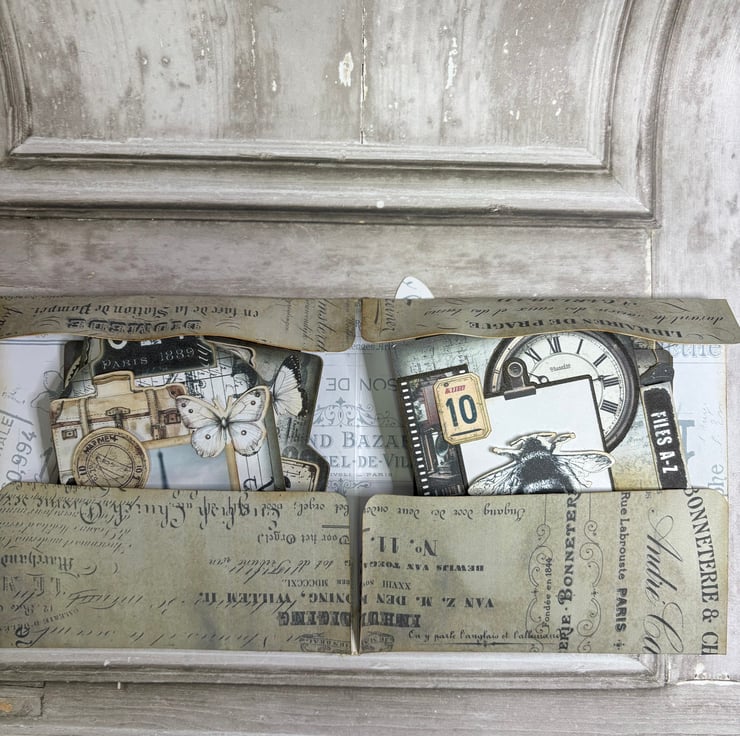 Tags, tags with pockets, collaged images curated to enhance the style. Comes in a pocket folder measuring 5” x 5” with flaps and a cord tie with a steampunk charm and a glass bead. Add to journals or use as gift tags.