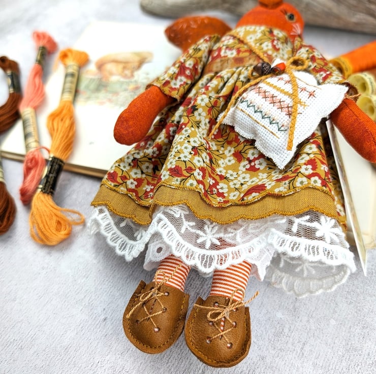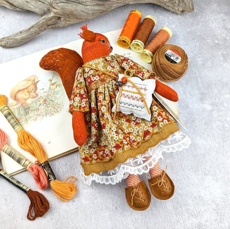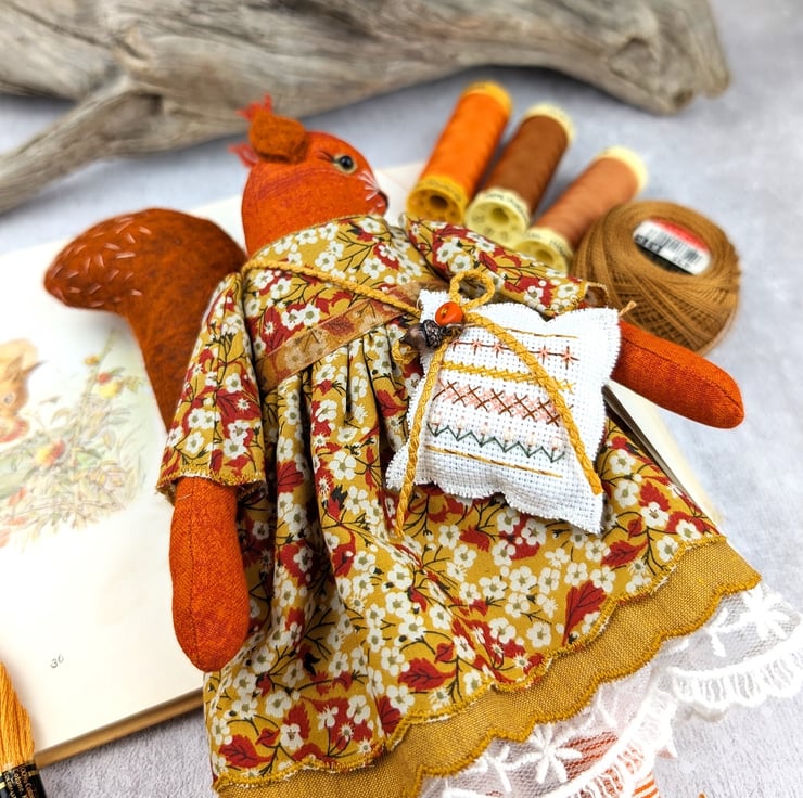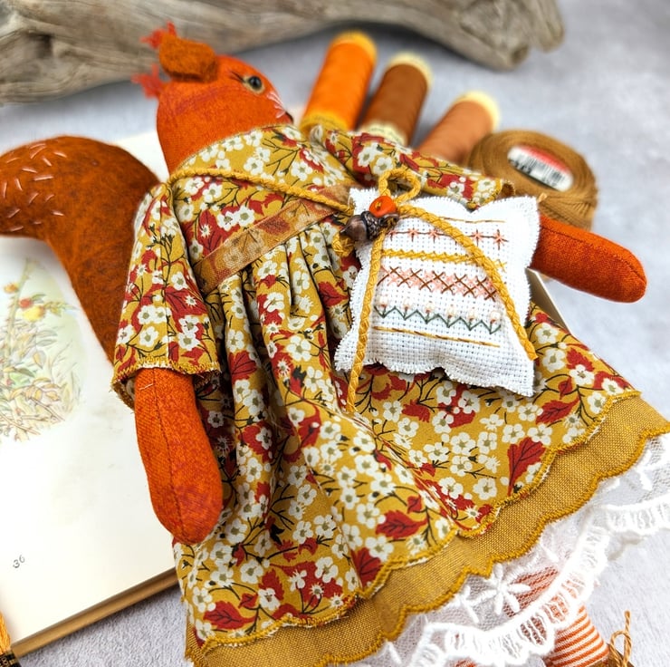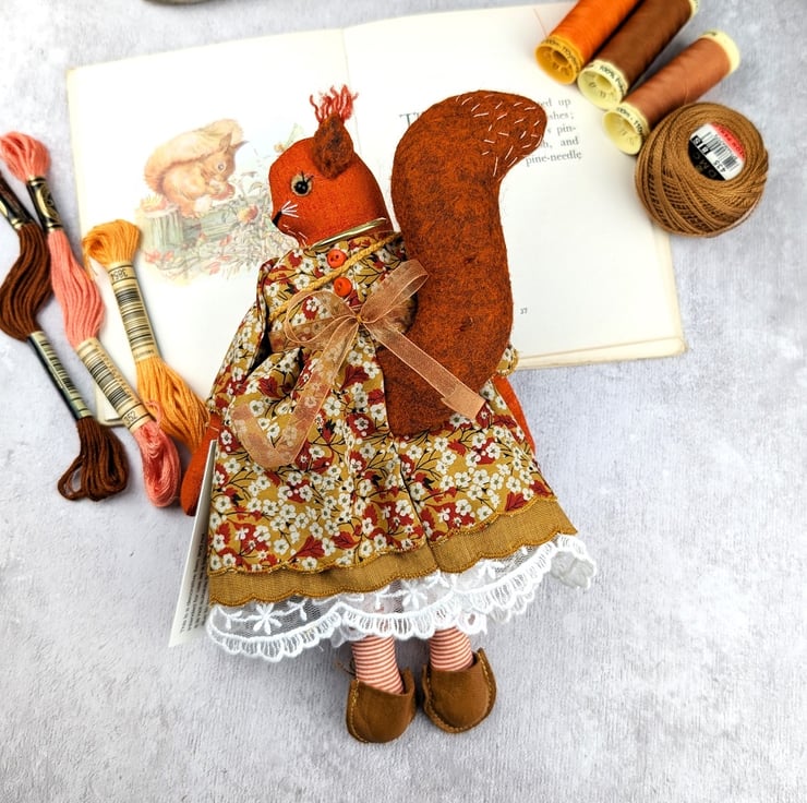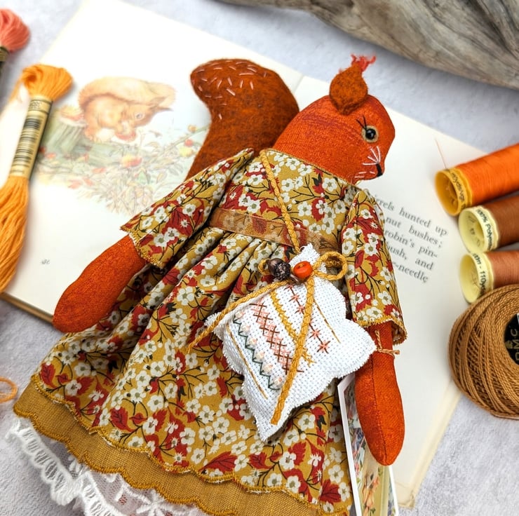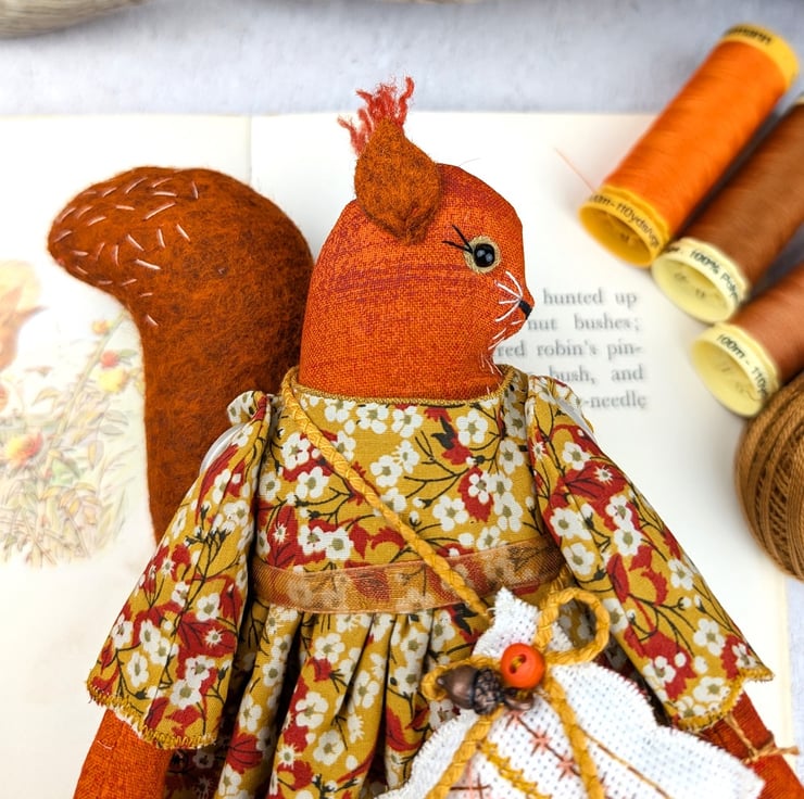 Acorn is a tiny red squirrel with wool felt tail ans tufty wool felt ears. Her face is hand embroidered with twinkling black beads for her eyes. She is dressed in a pretty Liberty Tana Lawn print dress in mustard called Mitsi Valeria Her underskirts are mustard shot cotton and white tulle lace. She is firmly stuffed with chamomile to her stuffing for a gentle scent and with a carnelian crystal to her heart.