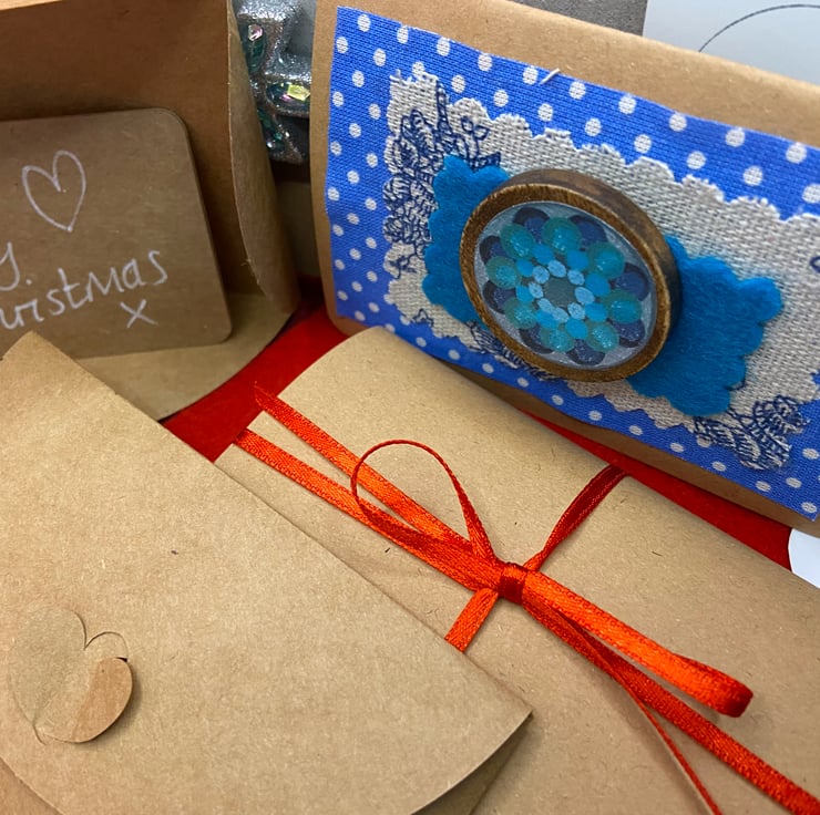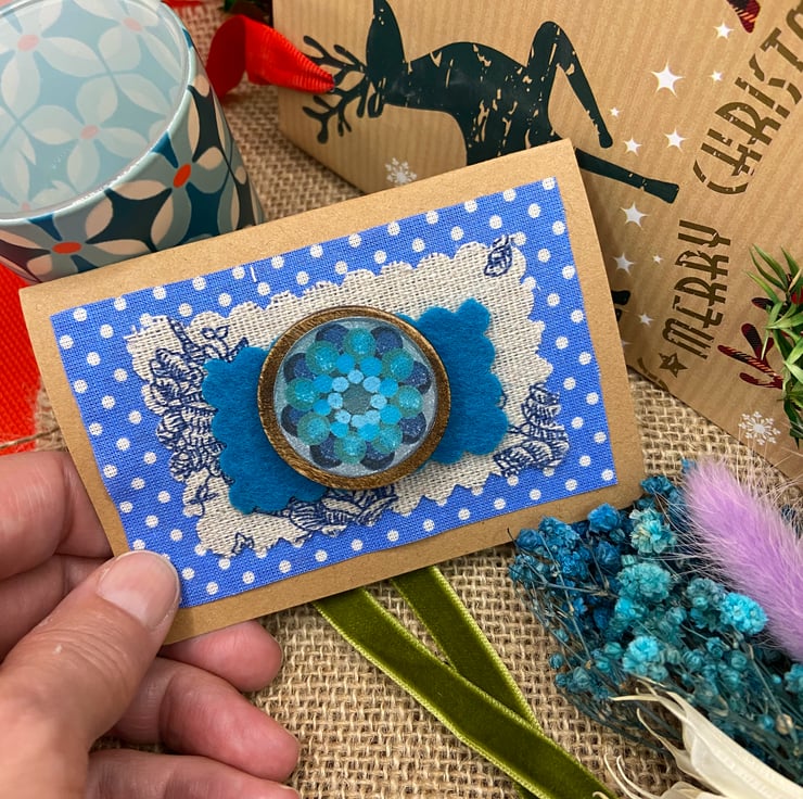 I think this brooch would be good for winter wear as its like a woolly warm flower. Great for a Christmas present or as a Thank you gift. I printed the design onto wooden transfer paper and hand painted the wooden disc with a blue water colour. I varnish it before and after placing the wood transfer. I also enjoy matching the fabric I use for the brooches display card.