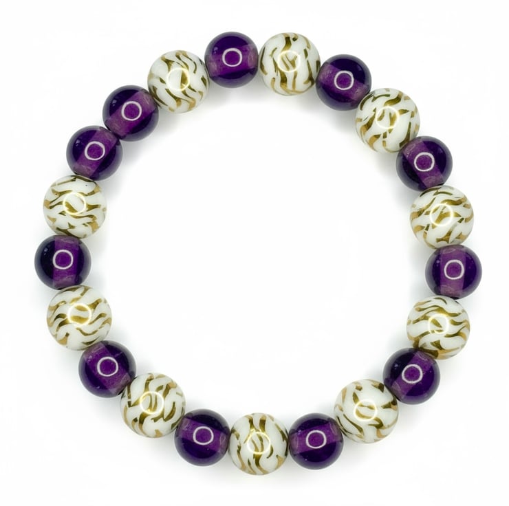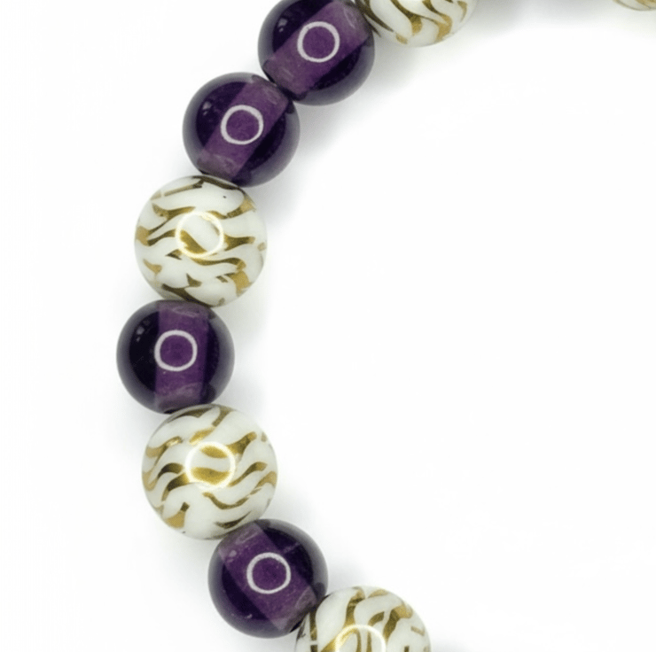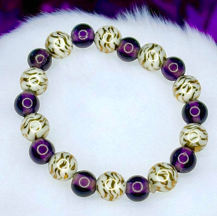 Add a touch of elegance to your outfit with this eye catching stretch bracelet, featuring a captivating combination of 10mm pearly white glass beads adorned with a chic gold tiger stripe pattern and rich dark purple 8mm glass beads. Designed for comfort, this elasticated bracelet fits wrists from 7 to 8 inches, making it a versatile addition to any jewellery collection. This bracelet will be thoughtfully gift wrapped in delicate tissue and presented in a beautiful organza bag, perfect for gifting or treating yourself.
