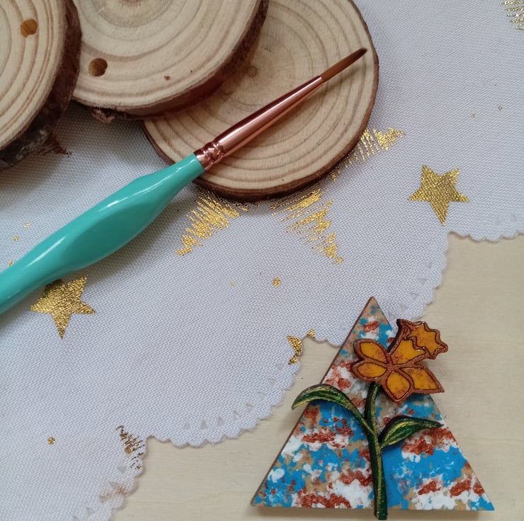 A 4cm sized triangle shaped wooden Fridge Magnet that has been hand painted with a blue, gold and white background featuring a raised daffodil detail