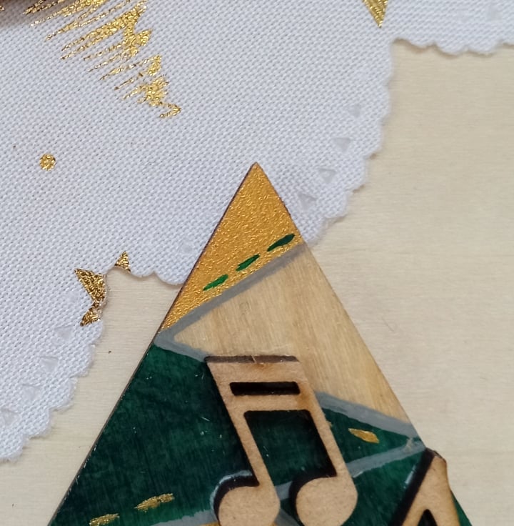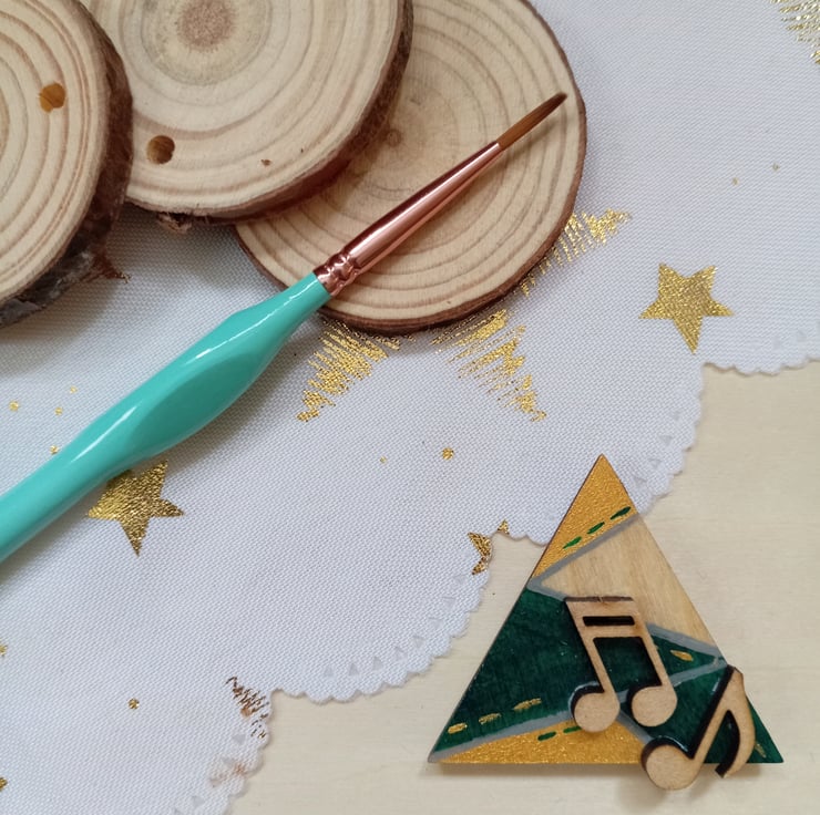 A 4cm sized triangle shaped wooden Fridge Magnet that has been hand painted in a gold and green design featuring 2 raised music note details