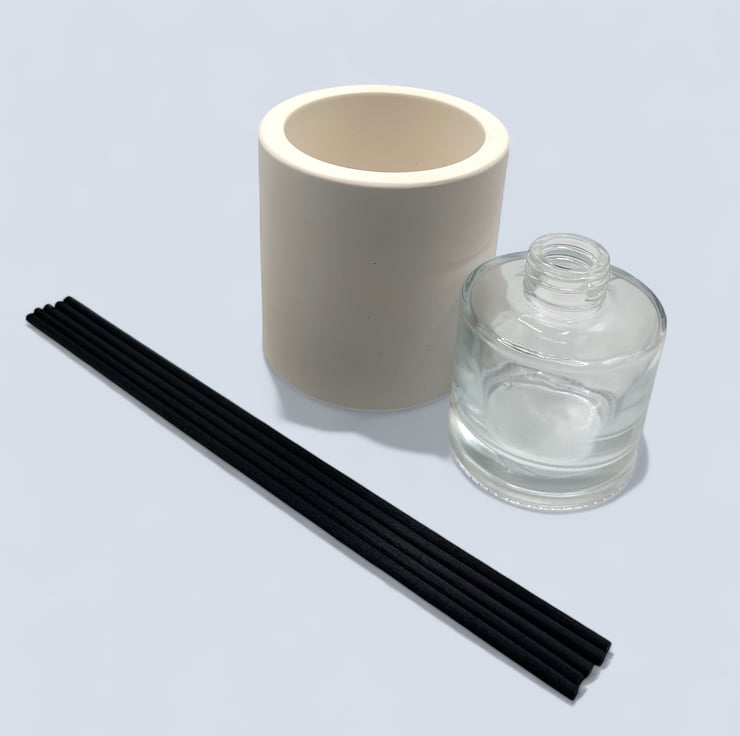 This handmade cylindrical white diffuser holder is specifically designed to accommodate 100 ml squat round diffuser bottles. It features a lid with a circular cutout at the centre, allowing for the easy insertion of reeds. Keeping the diffuser bottles within this holder can significantly reduce the risk of fragrance oil spills that could potentially damage surfaces.
