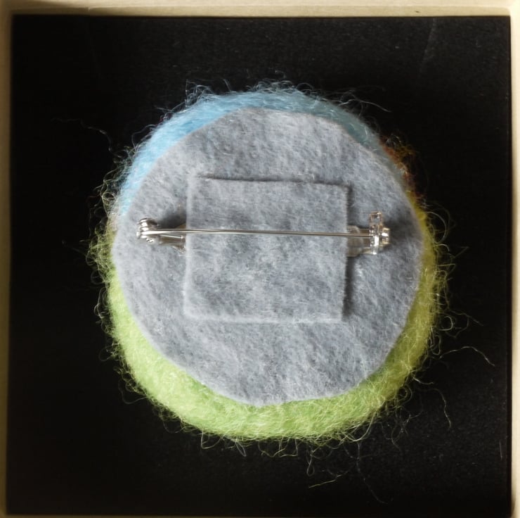 Handmade needle felted brooch featuring a colourful scene and sheep. Each brooch is unique due to the fibres used and is made purely of natural and dyed wools along with silk fibres and wool locks. They have a metal brooch clip on the back which sewn and has a felt covering to make it secure