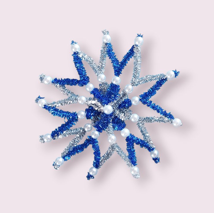 This elegant handmade snowflake star is crafted from shimmering blue and silver pipe cleaners, finished with pearl beads to create a frosty sparkle. Perfect for hanging on your Christmas tree, wreath, or garland, it adds a touch of festive magic and nostalgic charm.