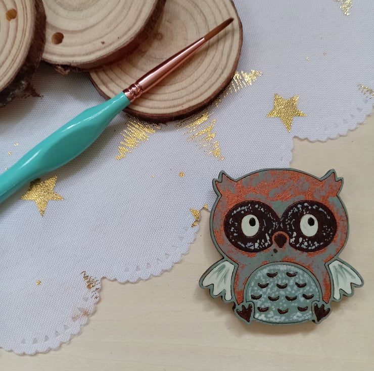 A 4cm tall owl shaped wooden Fridge Magnet that has been hand painted using acrylics