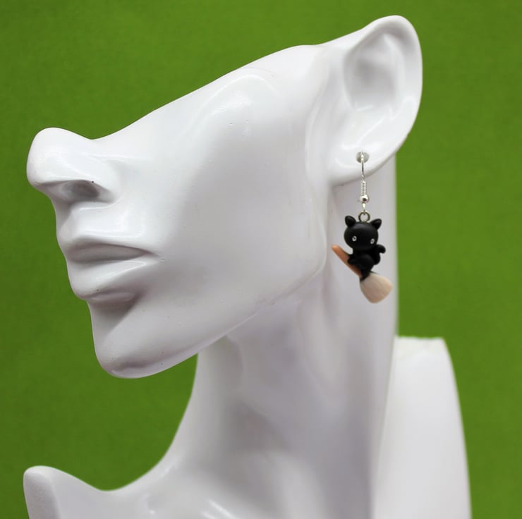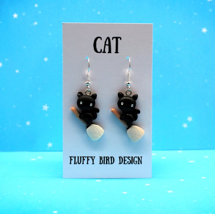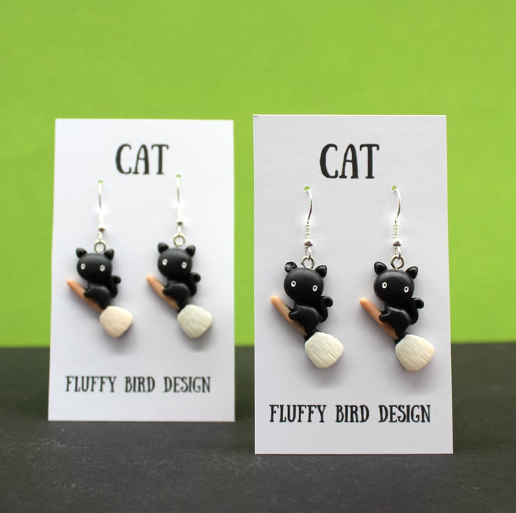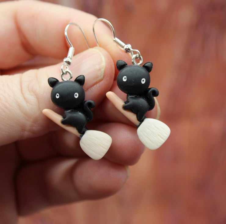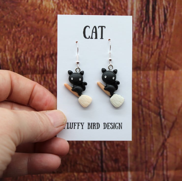 Broomstick Cat Earrings, Spooky Witchy Jewellery, Quirky Halloween Dangles