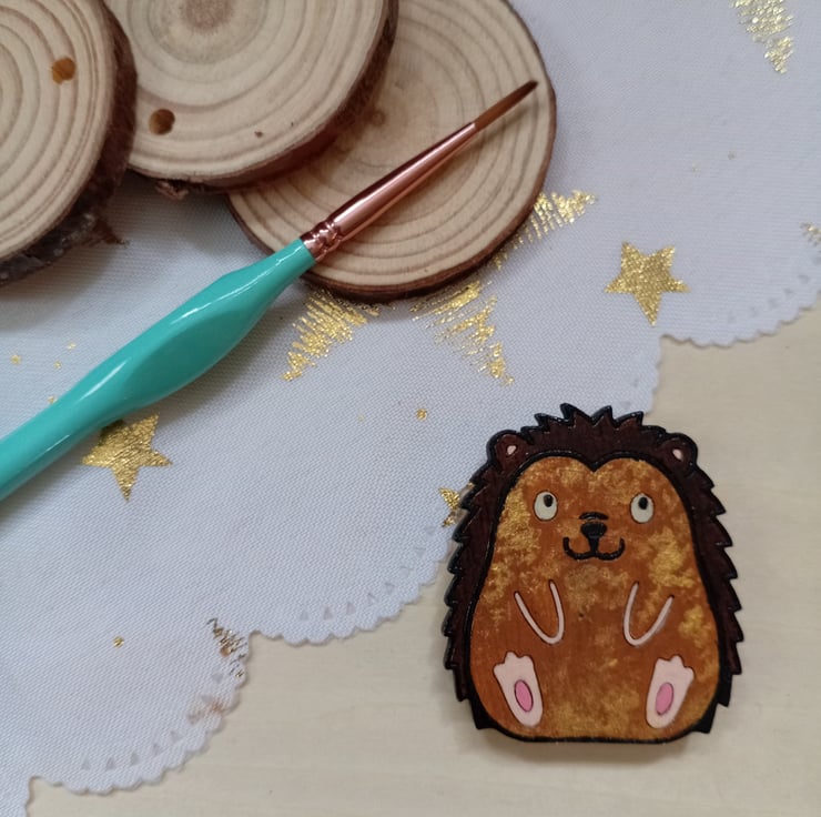 A 4cm tall hedgehog shaped wooden Fridge Magnet that has been hand painted using acrylics