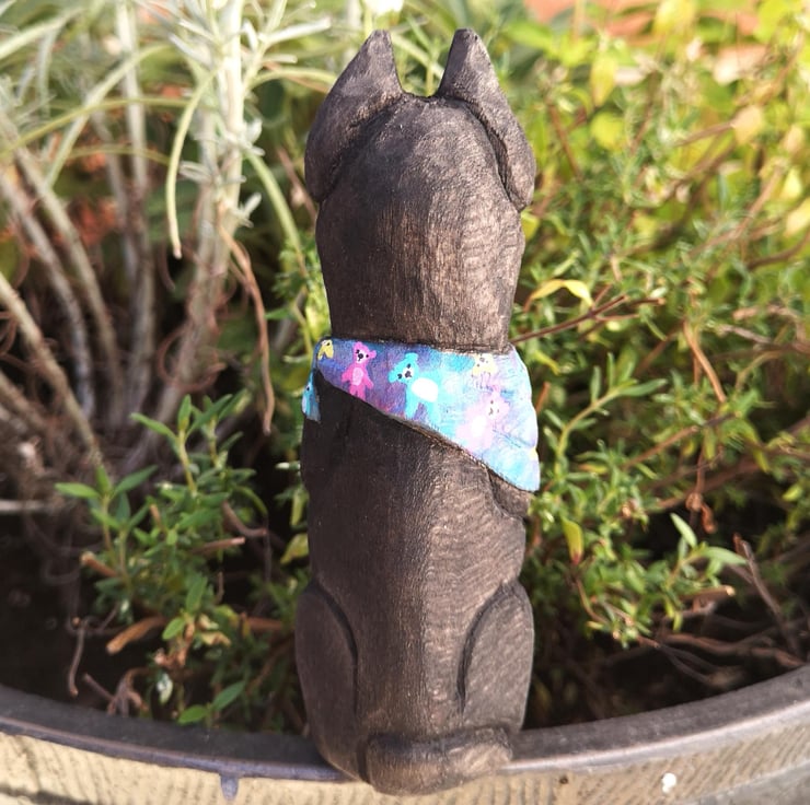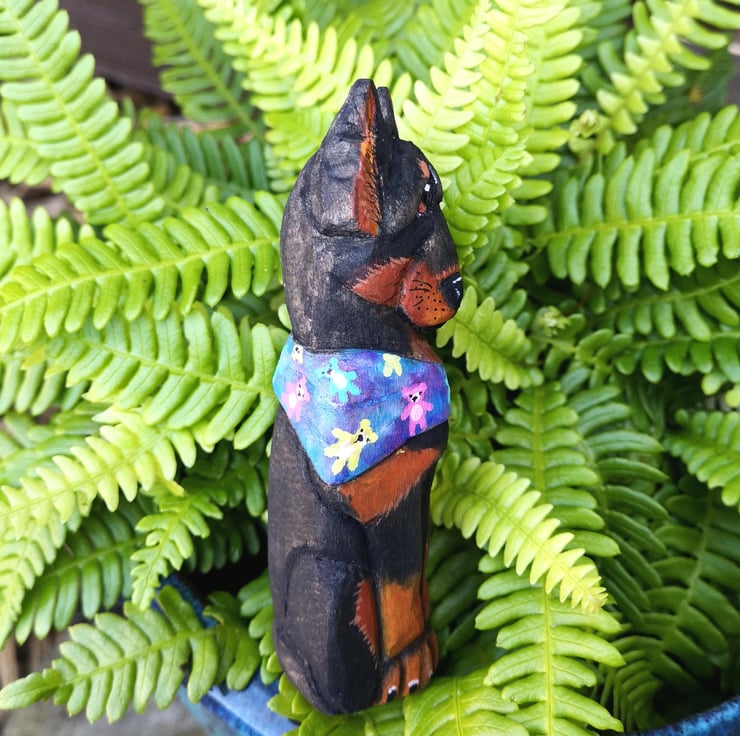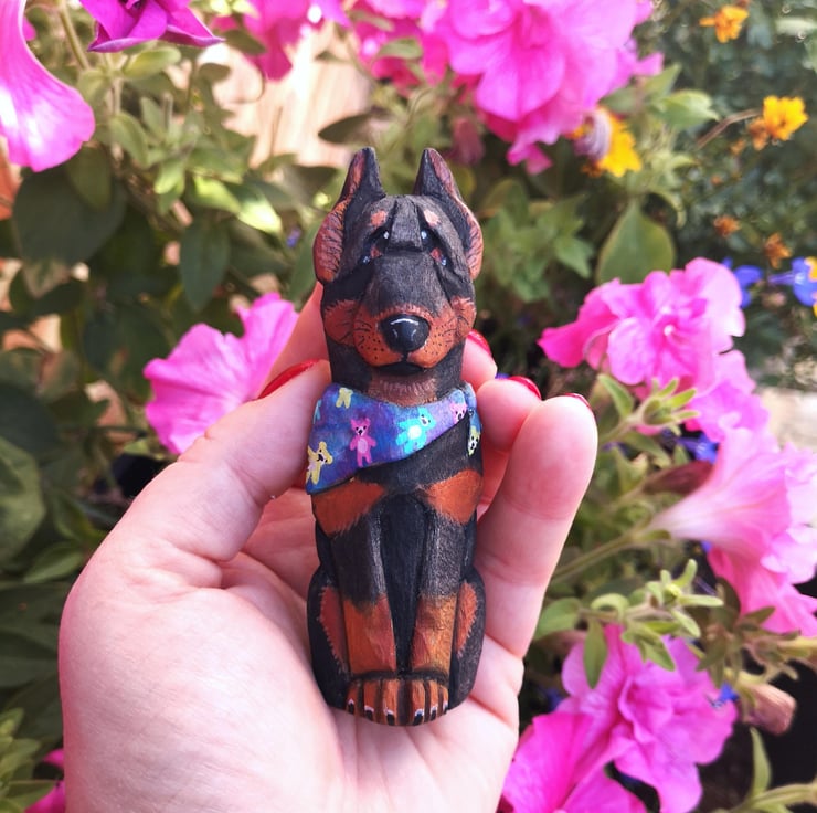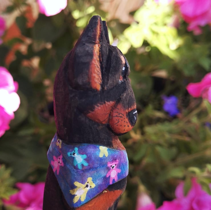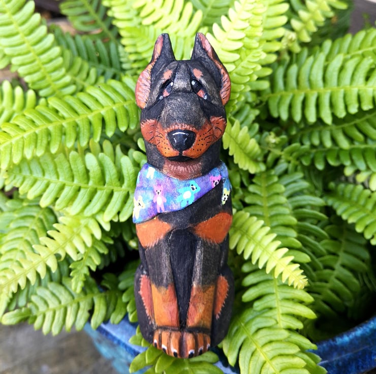 Donut is a hand-carved, hand-painted Doberman with a heart full of mischief and a bandana full of teddy bears. Crafted from basswood and brought to life with watercolour, acrylic paint, and a protective coat of Danish oil, he s a sweet treat for any shelf, nook, or dog-loving home.