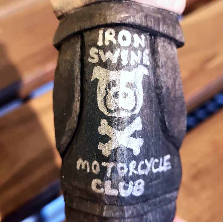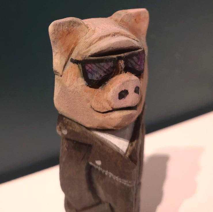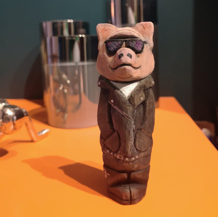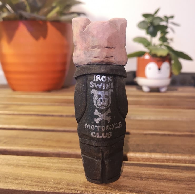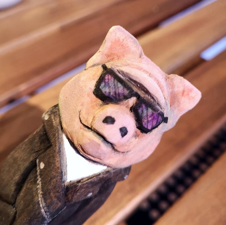 Hand carved, painted and finished wooden Harley the Biker Pig
