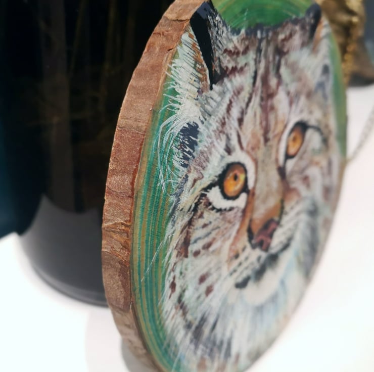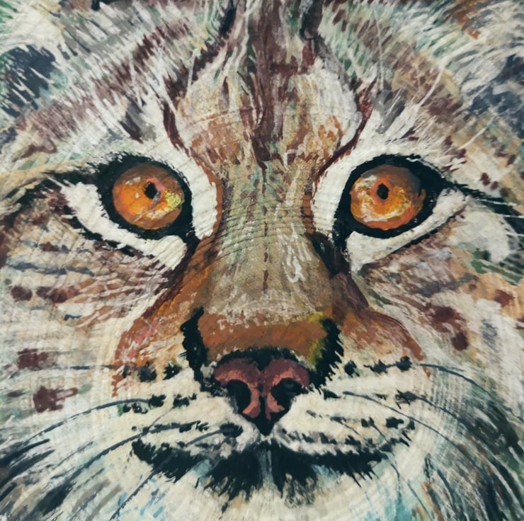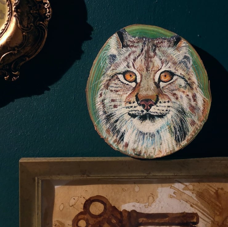 A portrait of a beautiful Eurasian Lynx, painted in acrylic. Created on a gorgeous wood slice, complete with bark around the edges.