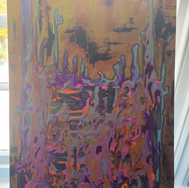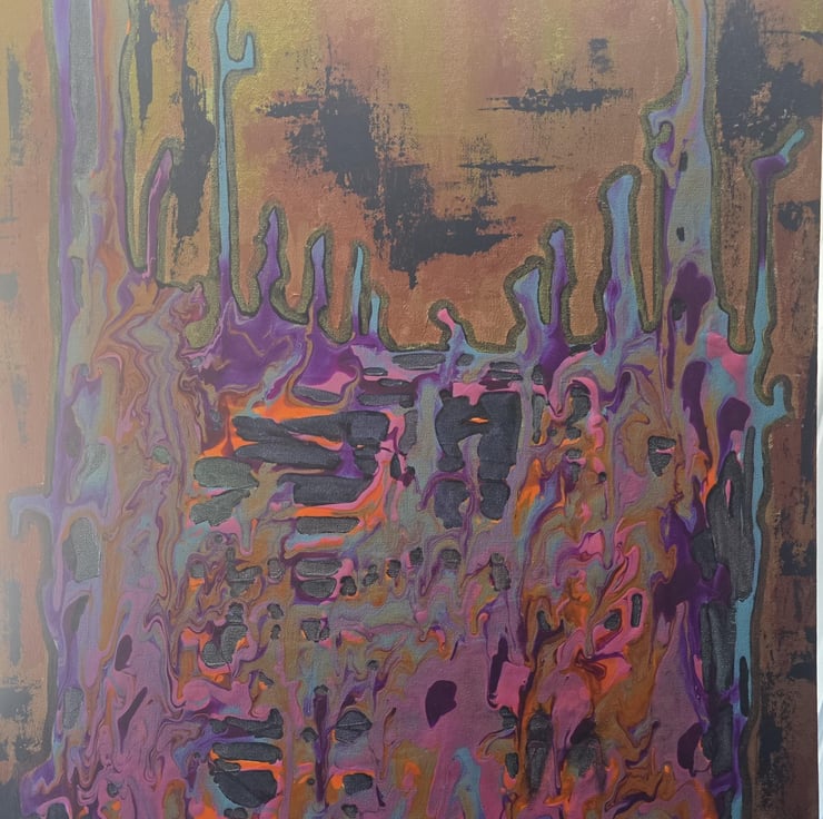 The paints have a beautiful iridescent sheen, creating an ever-changing shift in perception of the piece, depending on the lighting and angles.