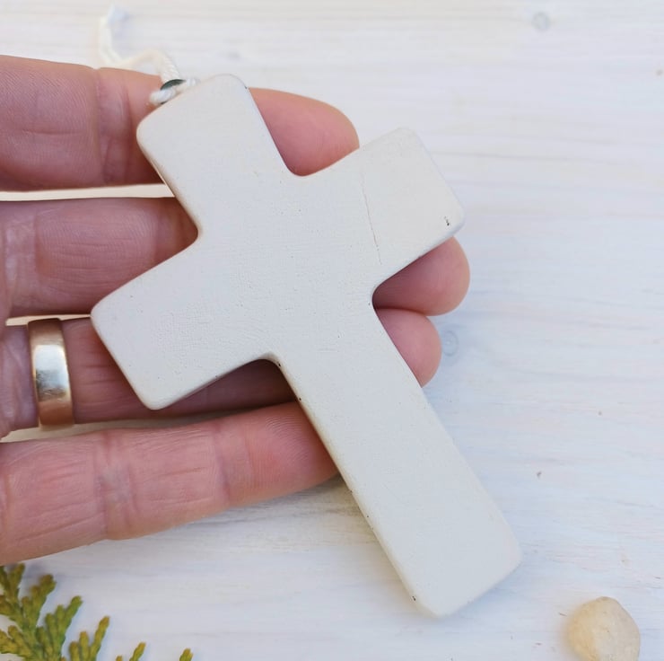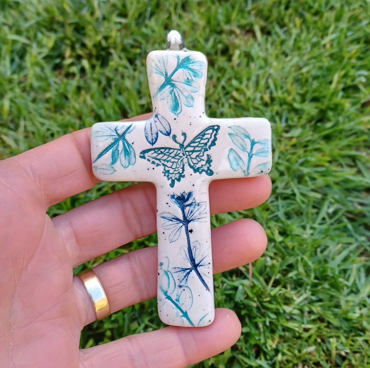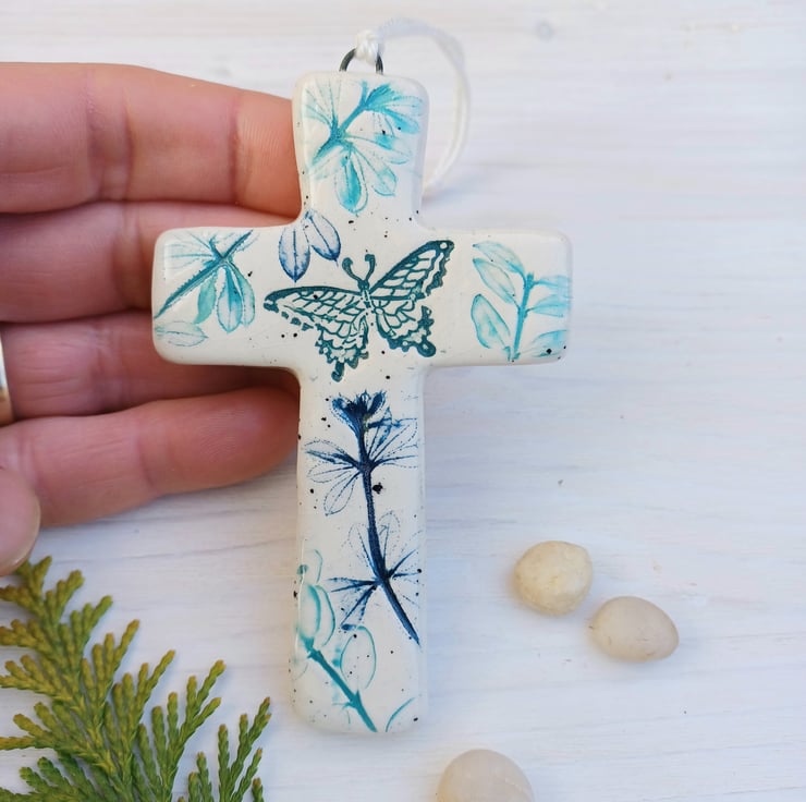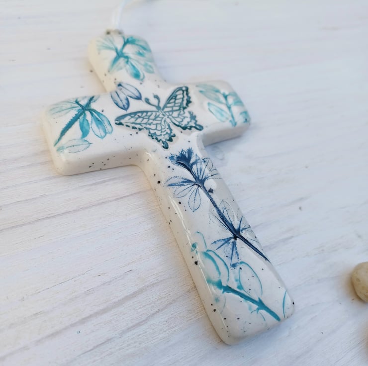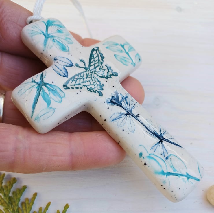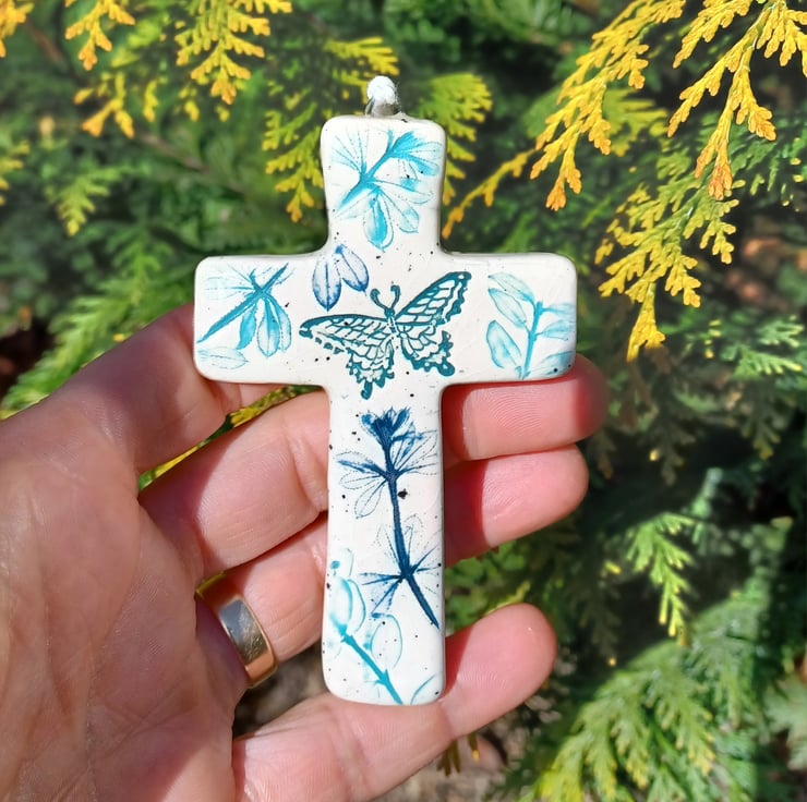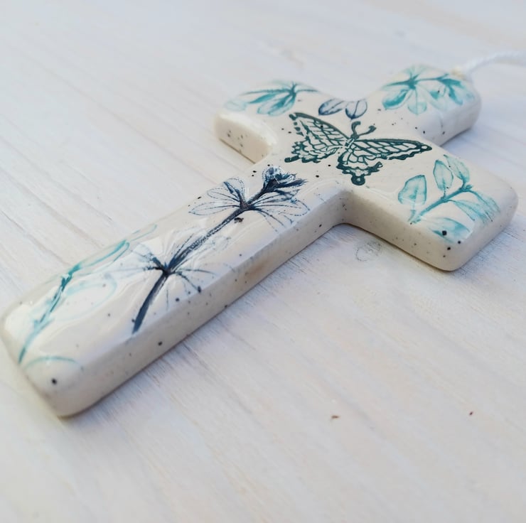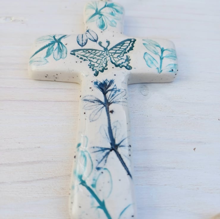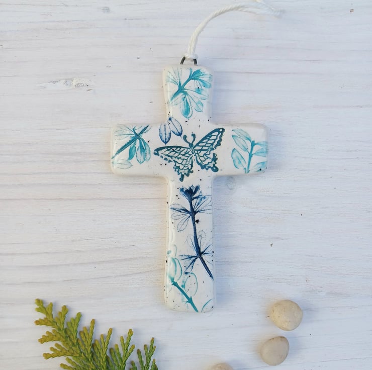 A beautiful handmade Ceramic Cross decoration with a Butterfly. Real flowers and leaves have been carefully pressed into earthenware clay, leaving a beautiful textured botanical impression. The clay has then been cut and shaped by hand into a cross.