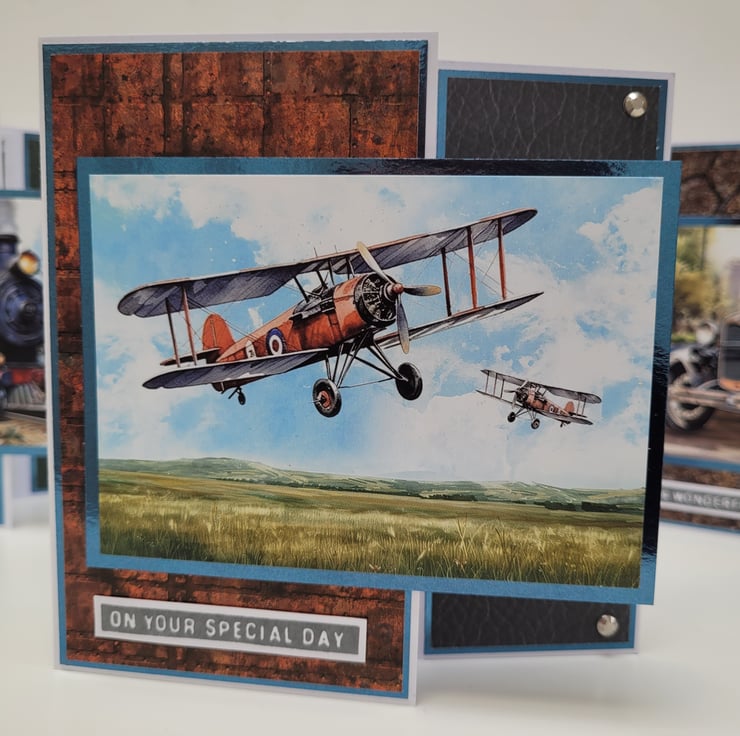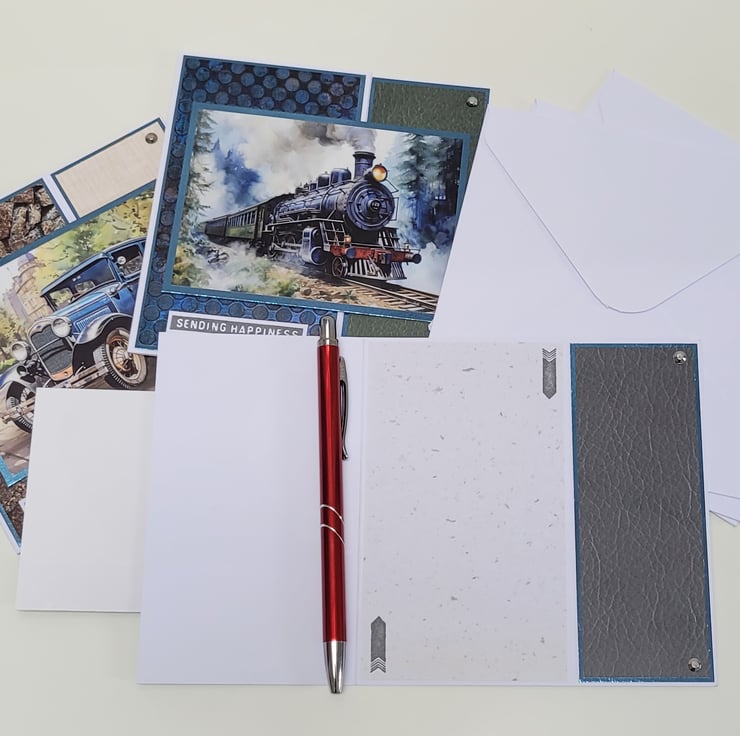 A handsome set of three greetings cards featuring nostalgic images of a plane, train and car, perfect for many occasions.