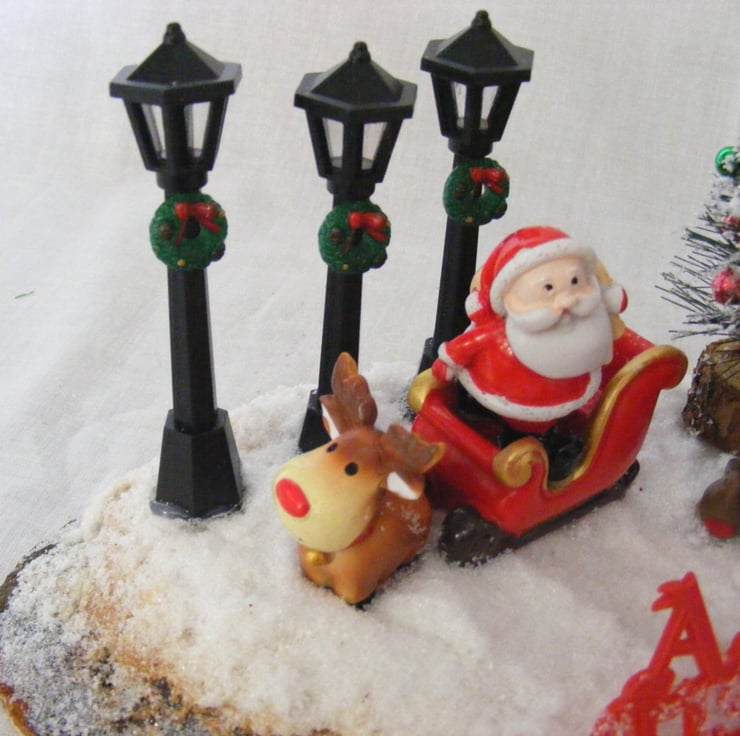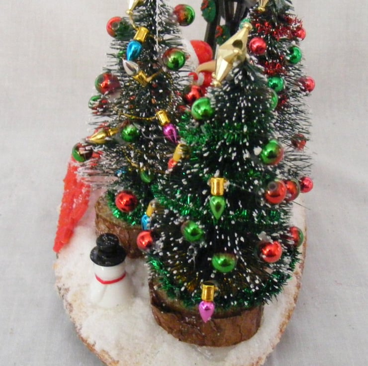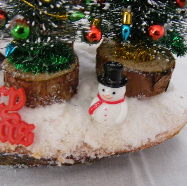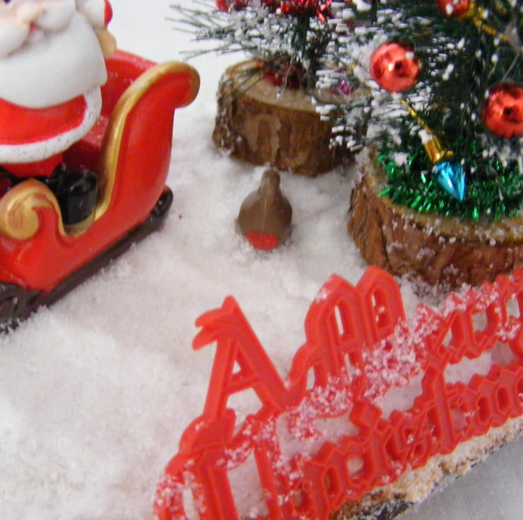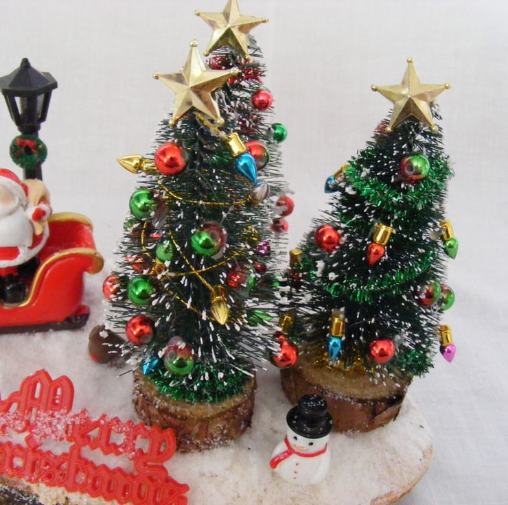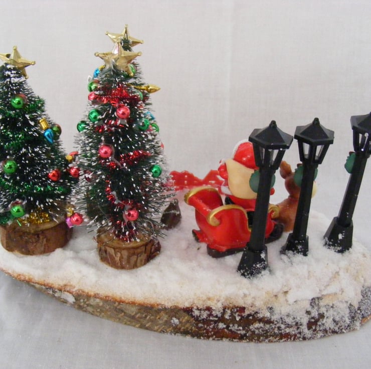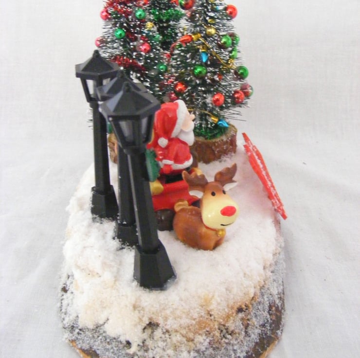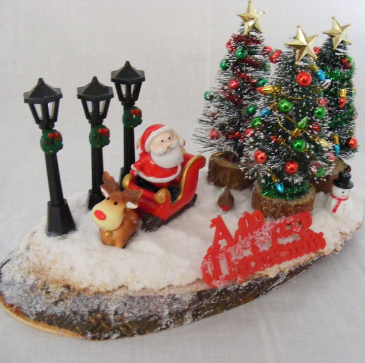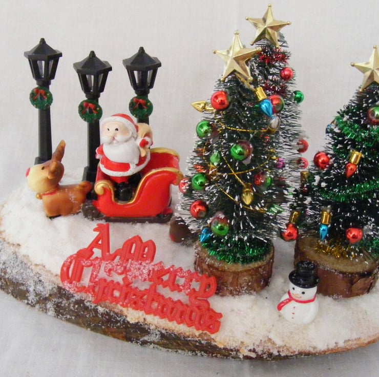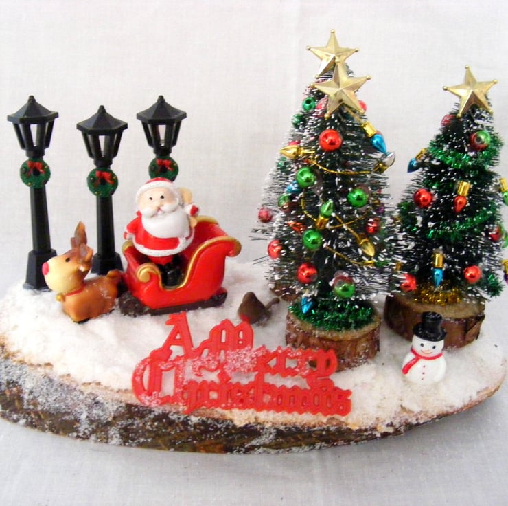 This festive table decoration would look lovely sitting on a table or window sill. I've handmade this decoration with a log slice, Christmas trees, Snowman, robin, santa and sleigh, non working lamps, a merry christmas sign and fake snow.
