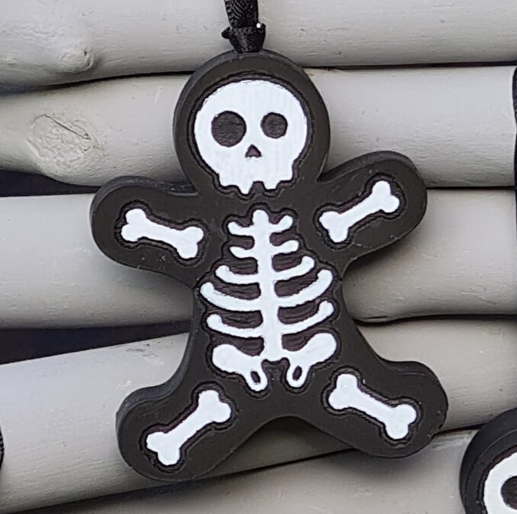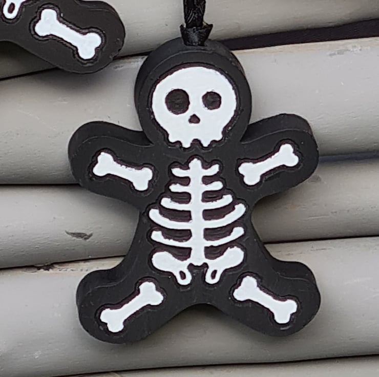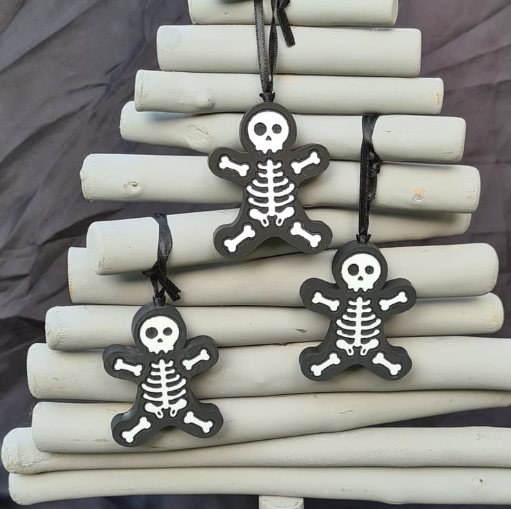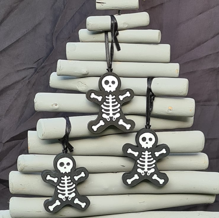 A Creepy cute set of 3 Gingerbread Skeleton hanging decorations, perfect for your Halloween Tree or to Spooky up any space. Made from Eco-resin (Resin-crete) and painted Black and White. On a Black ribbon.