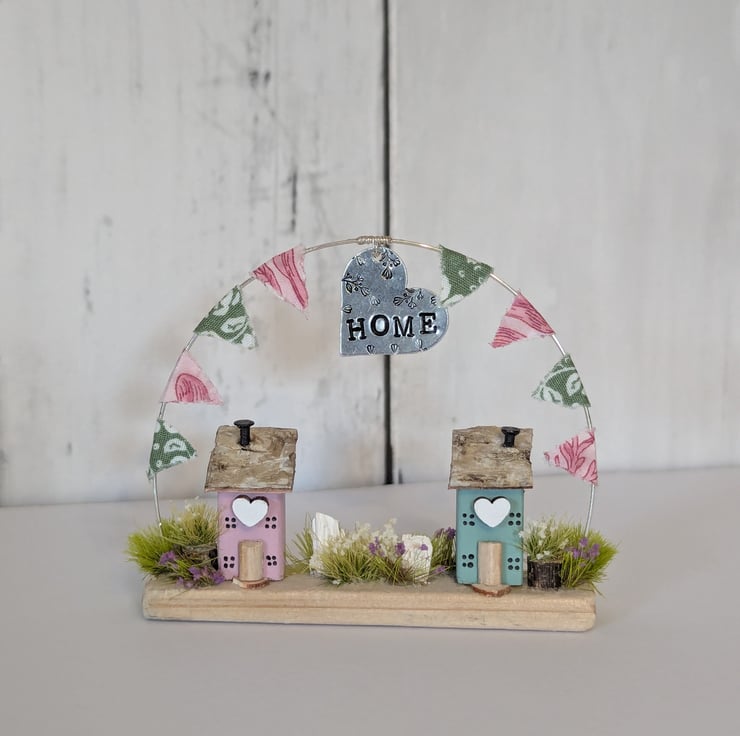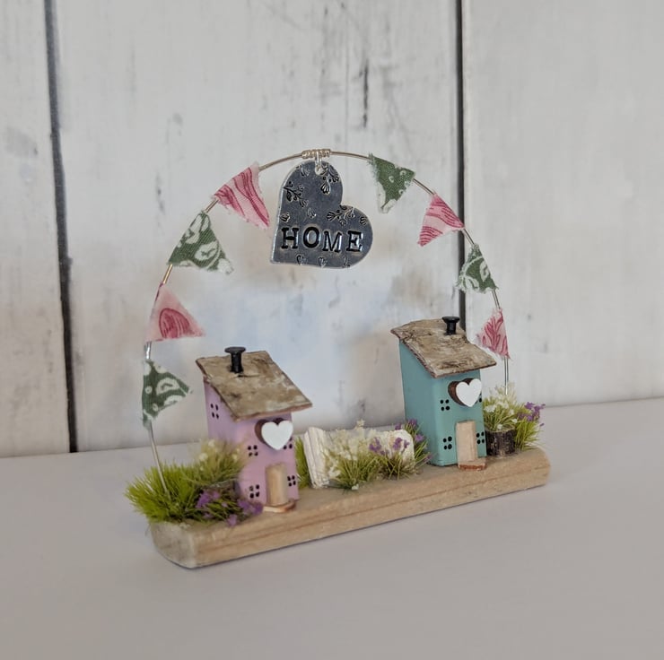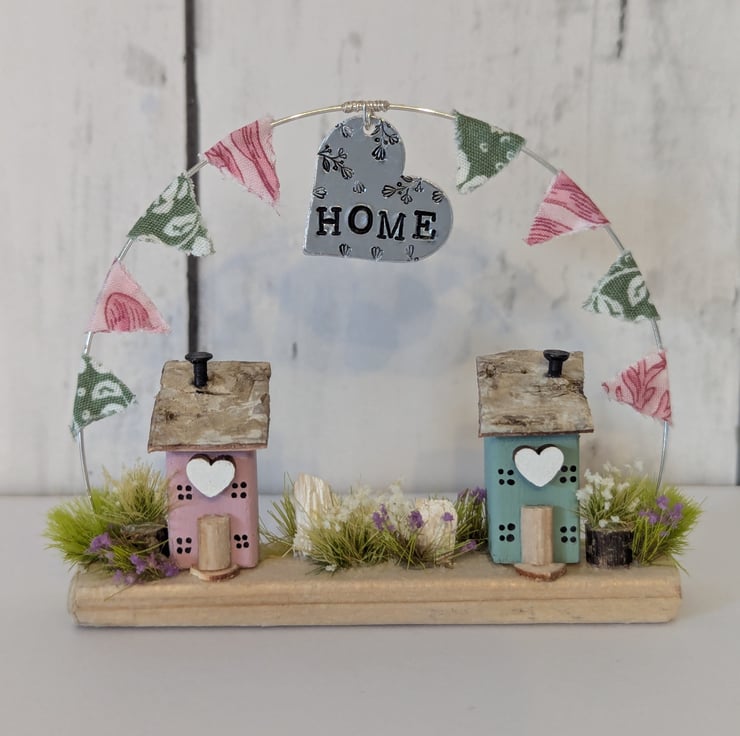 There is also a removable gift, a tiny wooden cottage scene on a wood base with pretty plants and Liberty fabric bunting arch with hammered home heart