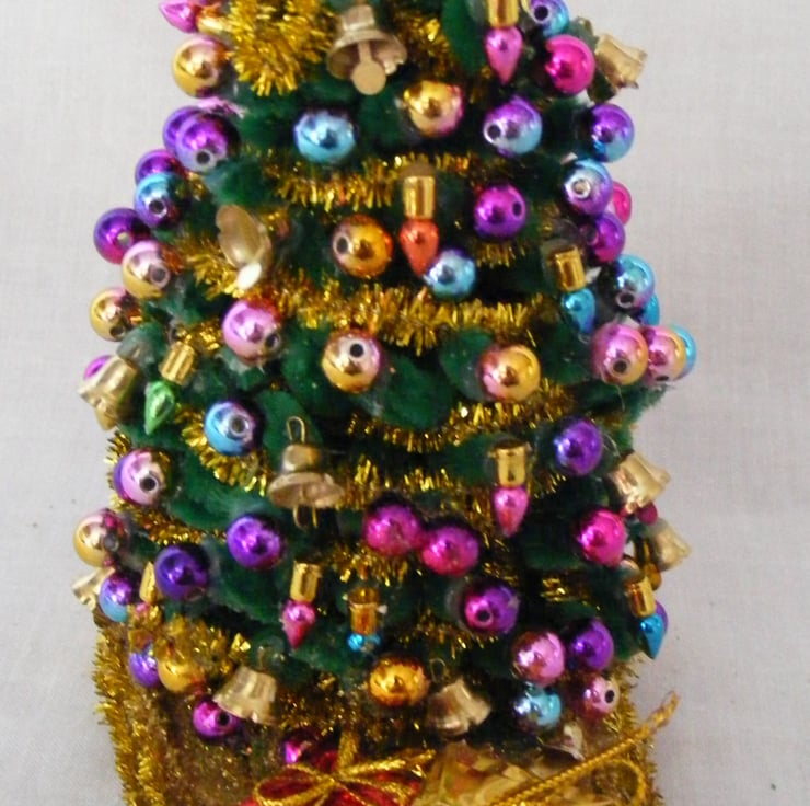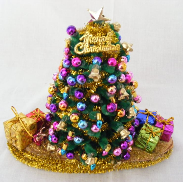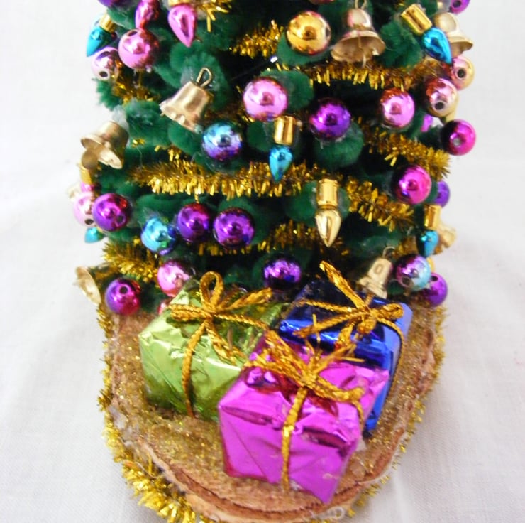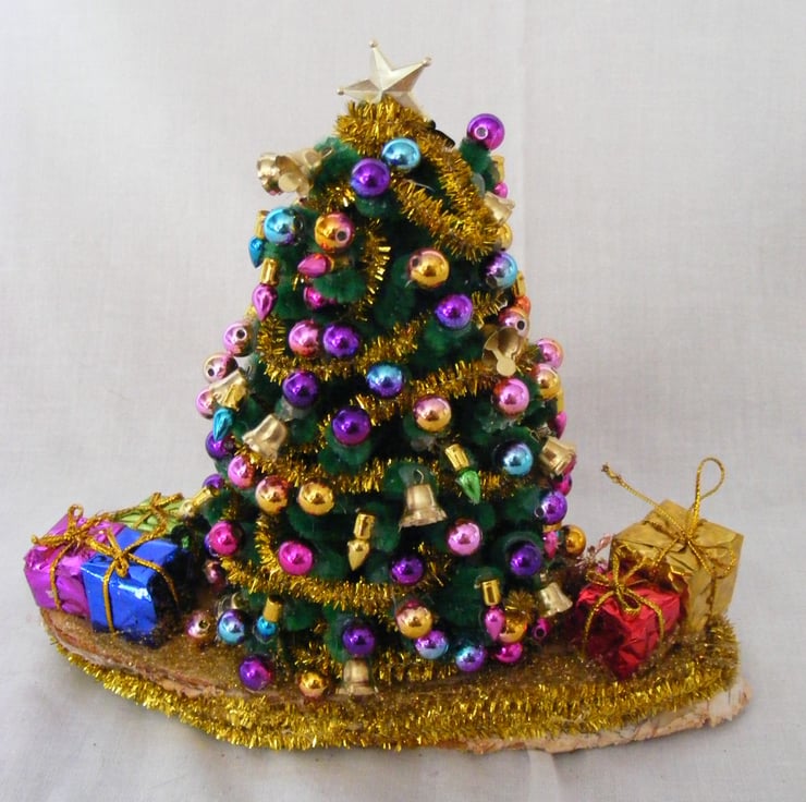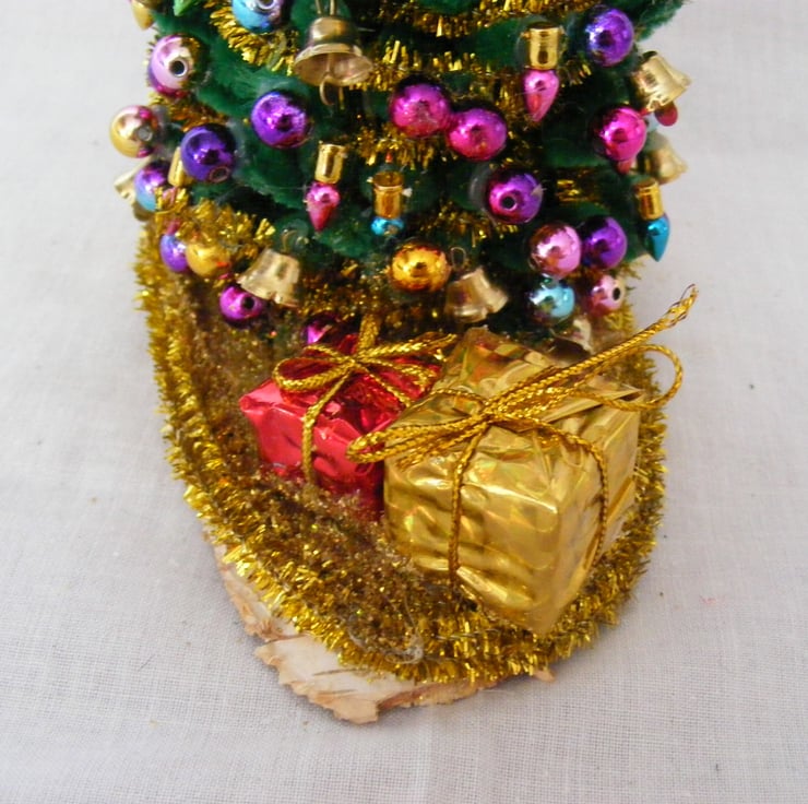 This Handmade Christmas table decoration would look lovely sitting on a table this festive season. Made with pipe cleaners, baubles, non working lights, bells and presents, all sitting on a log slice.