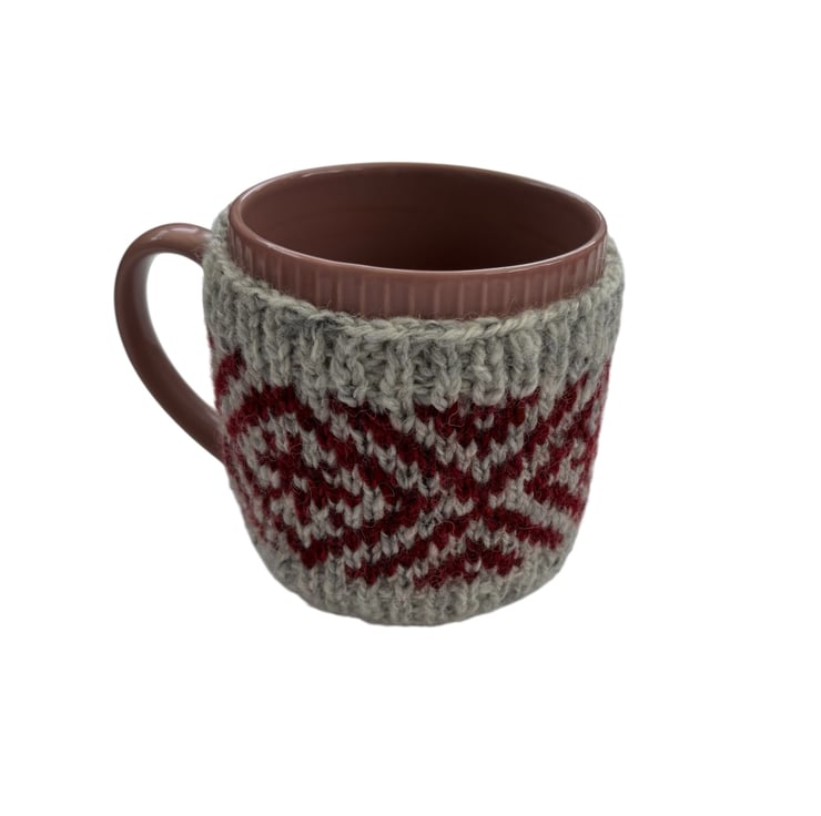 Hand knitted fair isle stranded knit mug cosy with large flower motif and chevron pattern. Lovely 100% wool mug hug. This is a small size mug cosy sitting 8 cm high and slides onto the mug with just the handle peeping out. The diameter of the mug I have it sitting on is 8cm.