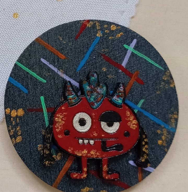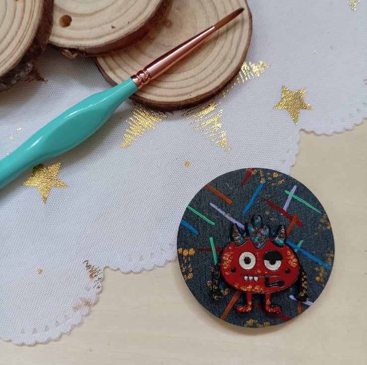 A 4cm round wooden Fridge Magnet that has been hand painted in a retro colourful line design on a dark slate grey background and features a raised red monster detail