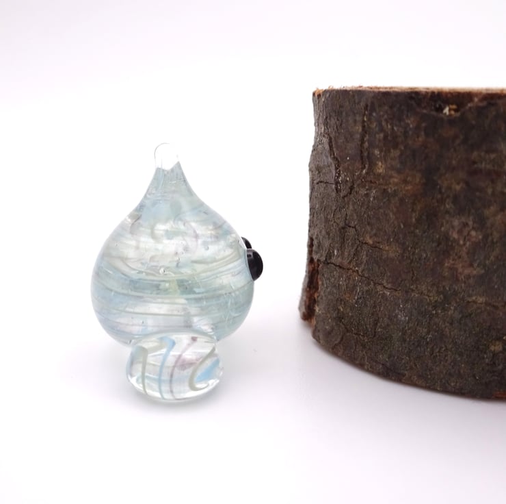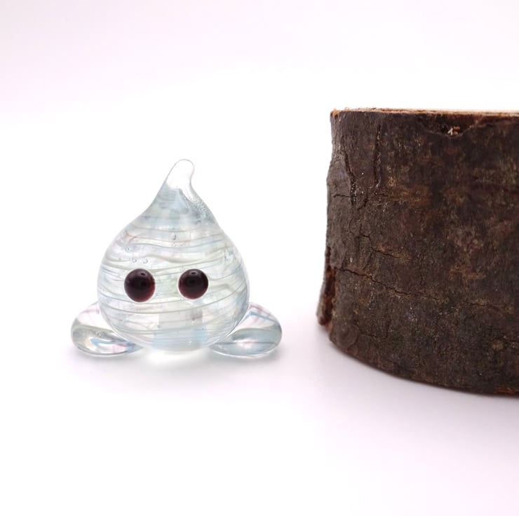 A small glass wisp figure made by hand using a technique called lampworking.