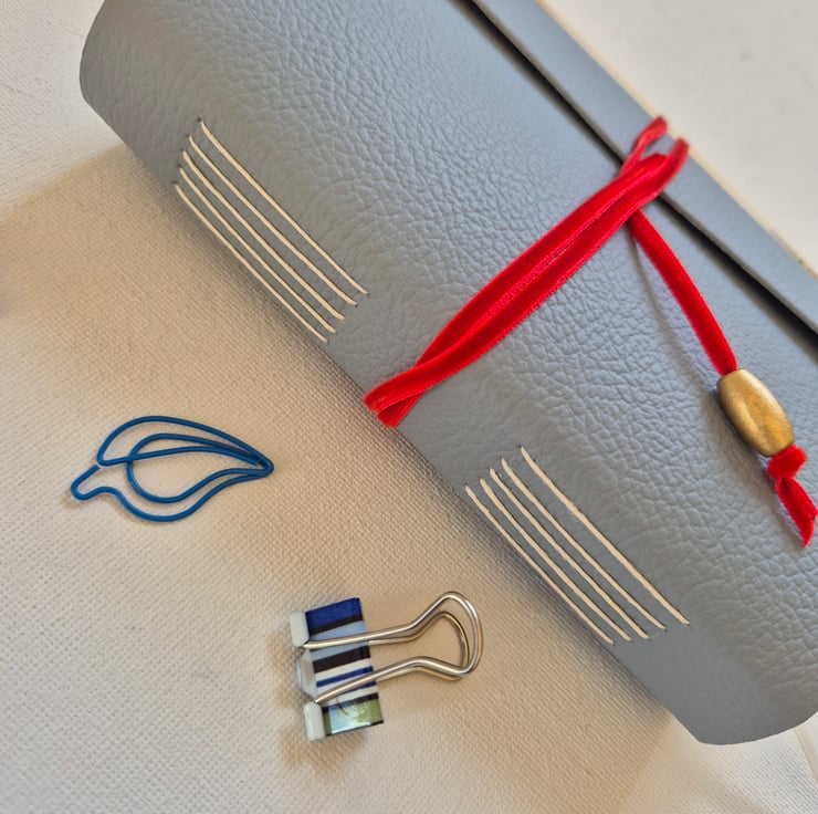 The Hand Bound Journal is A6 Size, approximately 10.5cm x 15cm x 2.5cm. Closed with a narrow velvet ribbon and finished with a gold wooden bead. Filled with 140 pages of 170gsm Cartridge Paper, perfect for writing, drawing, ink, printing, even light watercolour. There is a handy Ribbon page Marker and the Journal lies completely flat when in use.