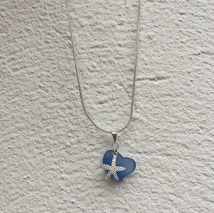 Necklace made with blue sea glass and a 925 Silver starfish and chain.