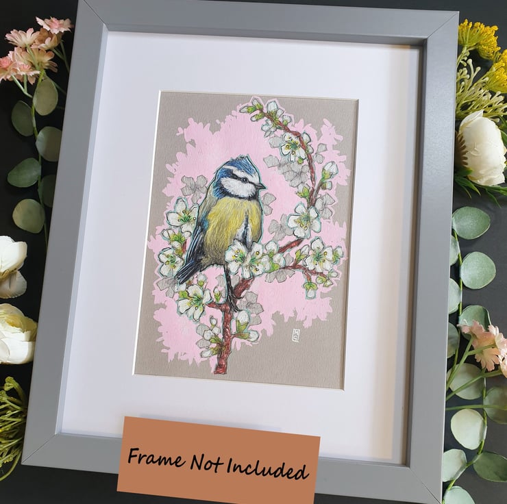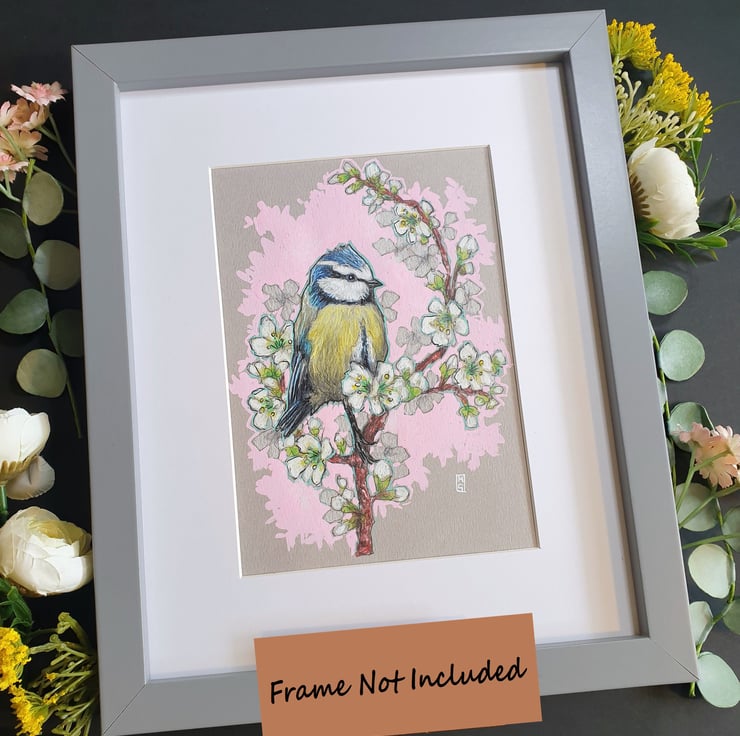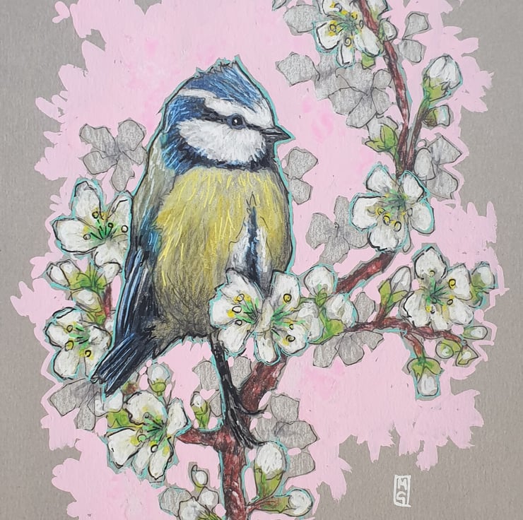 A small colour drawing of a little blue tit bird sitting on a branch that is covered in white blossom. The drawing has a pink background and is on grey pastel paper.