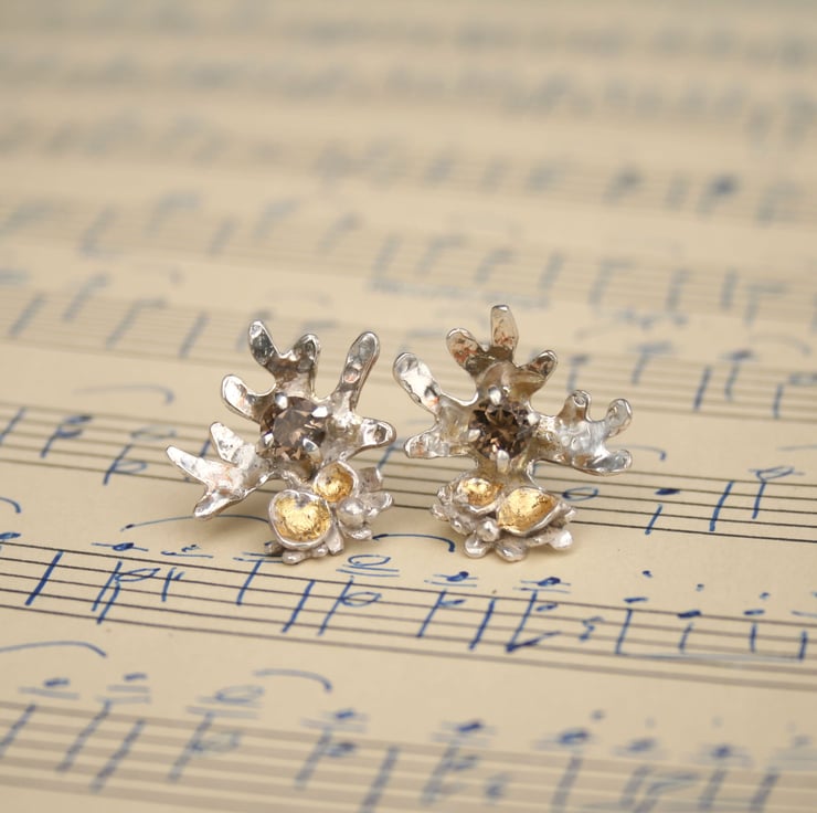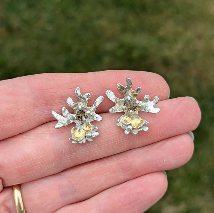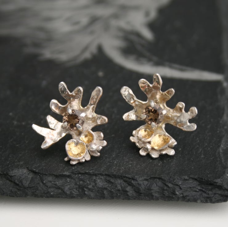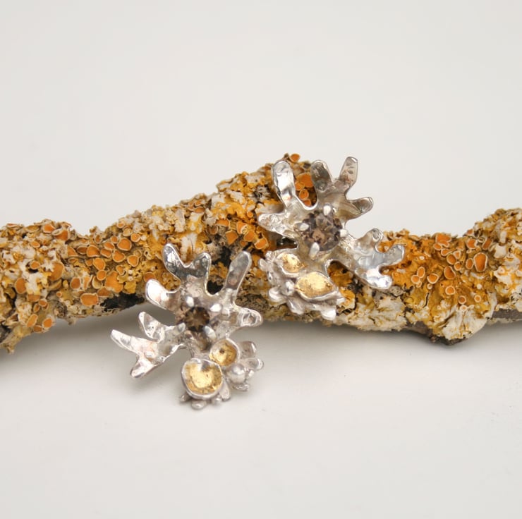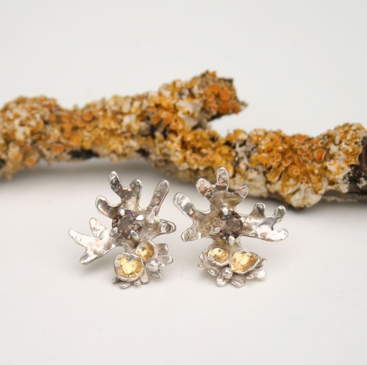 I’ve handmade these lichen-inspired earrings from recycled sterling silver, drawing on the textures of Scottish woodland. Each pair is unique, with two tiny lichen cups with 24ct gold foil using the ancient keum boo technique, and a 5mm smoky quartz gemstone held in silver claws.