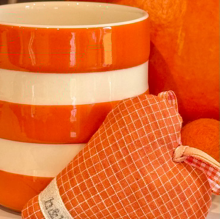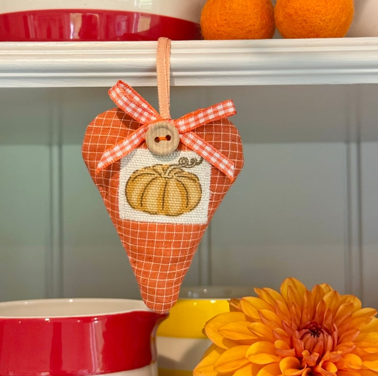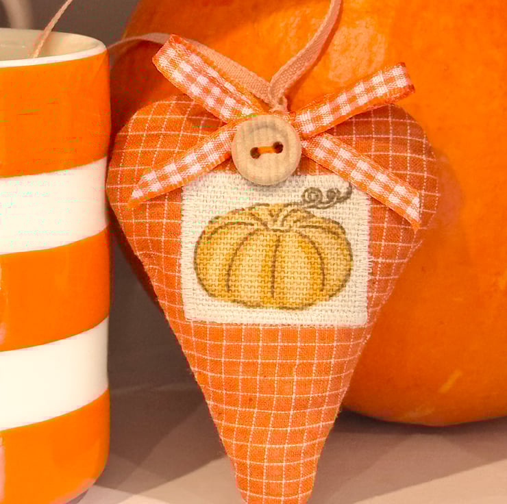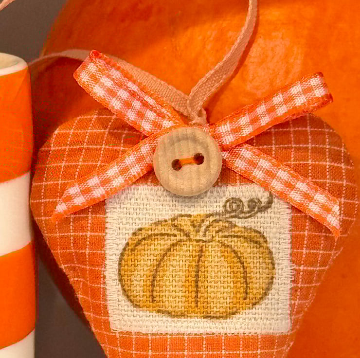 In autumnal orange windowpane-checks and with a patch featuring a a cute orange plump pumpkin. Generously filled with locally grown lavender (or with hypoallergenic wool toy stuffing) and finished with a rustic wooden button, orange ribbon hanging ties and an orange and white gingham ribbon bow.