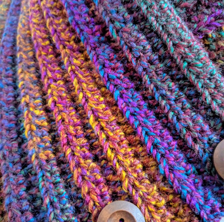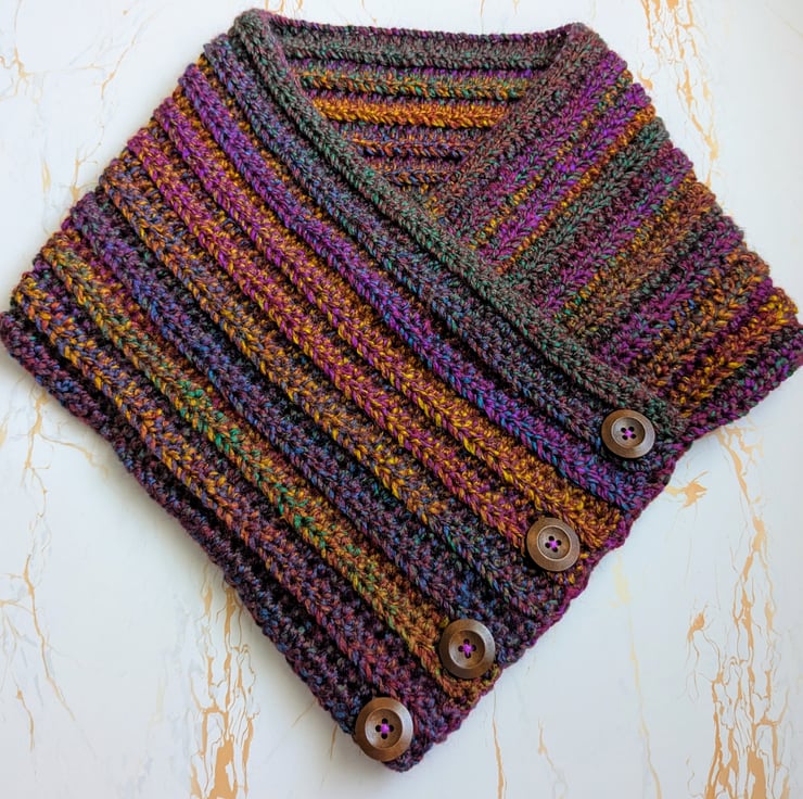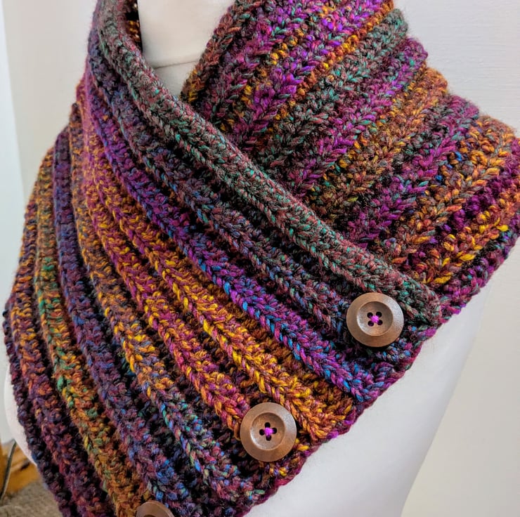 Crochet cowl with wooden buttons in beautiful,warm autumn colours.