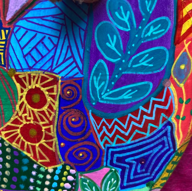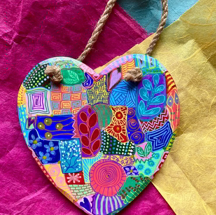 This is an up cycled wooden heart hand painted in a variety of colourful doodles. It hangs by a thick jute string