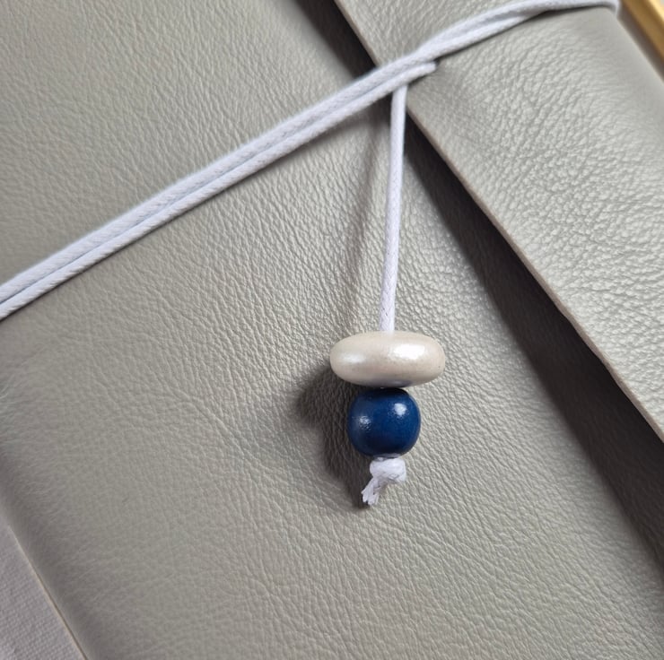 A5 size, (approximately 16.5cm x 22cm x 2.5cm) Hand Bound in Silver Grey Leather and closed with a white cotton cord and two wooden Beads. There is a handy Ribbon Page Marker and the Journal lies completely flat when in use. Filled with 140 pages of 170gsm Plain Cartridge Paper, perfect for writing and sketching.