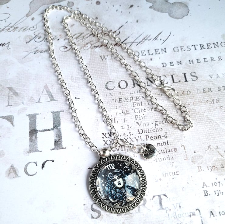 Beautiful zodiac pendant necklace with optional personalised heart charm initial. This pendant depicts the sign of Virgo. The image is laser printed by me, then encapsulated beneath a crystal clear glass cabochon.