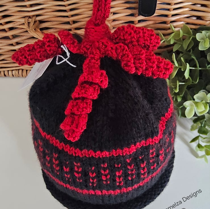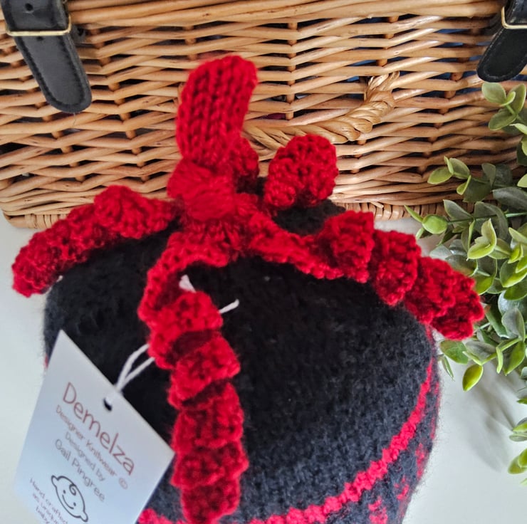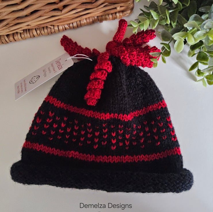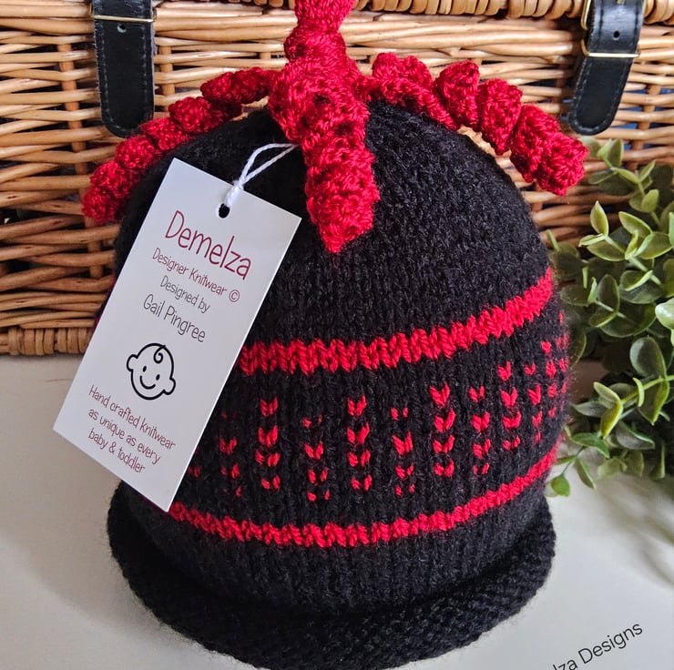 A cute practical baby/toddler's hat designed and hand crafted in Cornwall using quality branded light weight soft machine washable acylic yarns. On the top are five hand knitted squiggles in a solid red colour. They have been hand knitted separately then knitted within the main construction for total safety.
