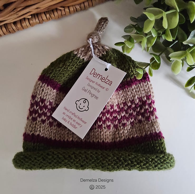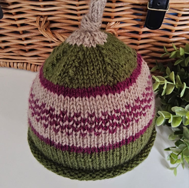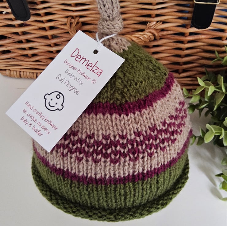 A unique eye catching baby traditional fairisle hand knitted knotted pixie hat lovingly designed in Cornwall for those seeking total individuality and quality. The yarns used are premium machine washable acrylic. This adorable little hat will make a perfect token gift for any mother and baby to receive.