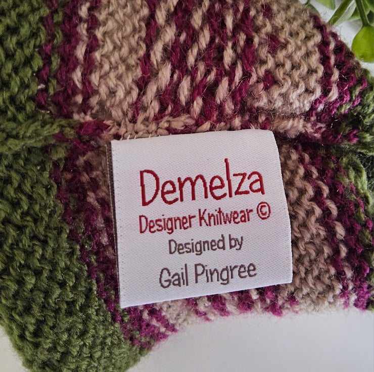 The luxury soft damask garment label has been hand sewn to the inside of the hat seem with the care instructions woven within it for lasting reference. A matching Demelza Designs garment swing tag is attached for a totally professional finish one expects from quality designer garments.