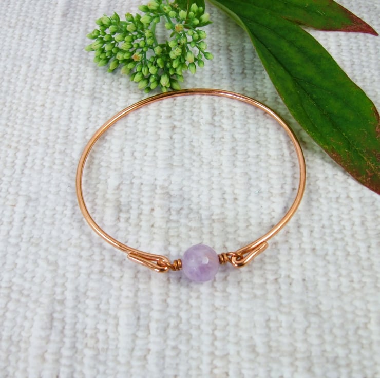 I have made the bangle from 2mm solid copper wire which I have flattened the ends and shaped and hammered to texture. At the centre of the bangle I have securely wire wrapped an amethyst gemstone bead. The bangle does not open and close and is designed to fit over your hand, please refer to the size guide photograph.