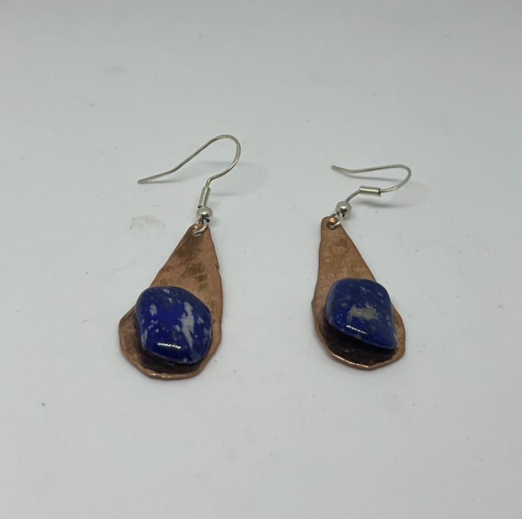 Handmade and beaten Copper Drop Earrings, solid Silver Ear Hooks and mounted with Lapis Lazuli
