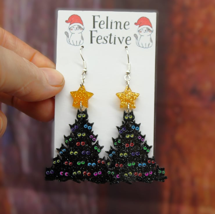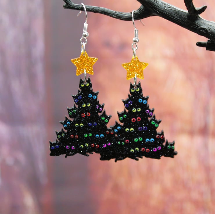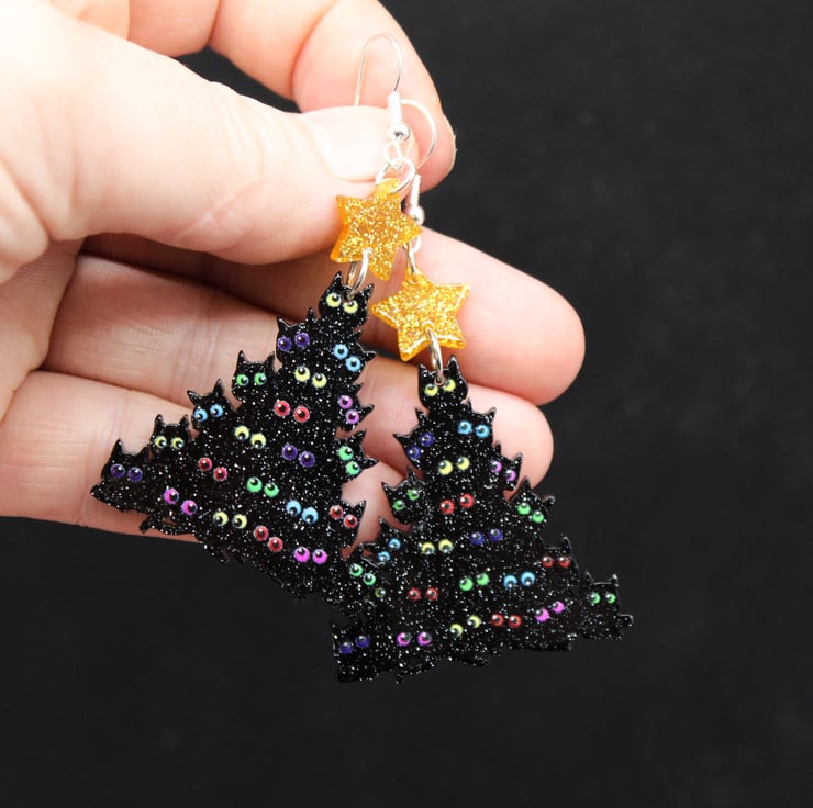Black Christmas tree earrings with cat's eyes and a glittering star — festive sparkle with a feline twist