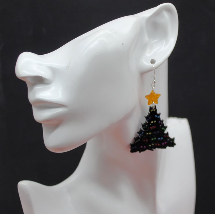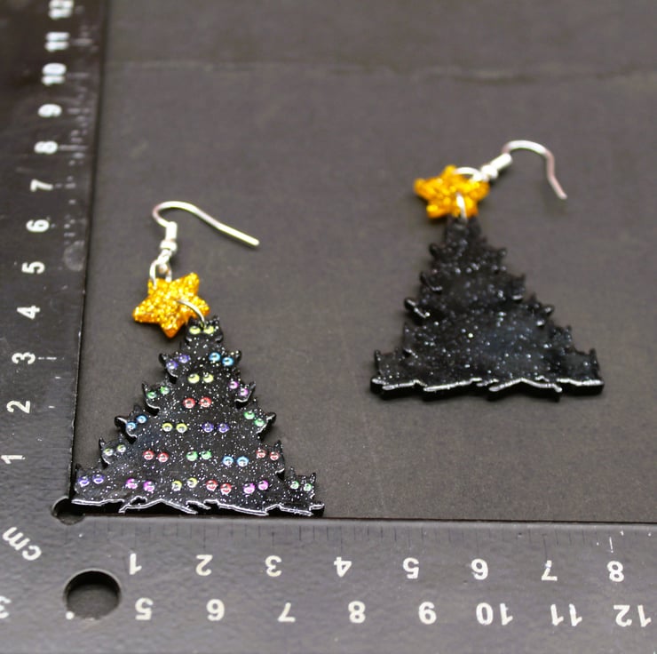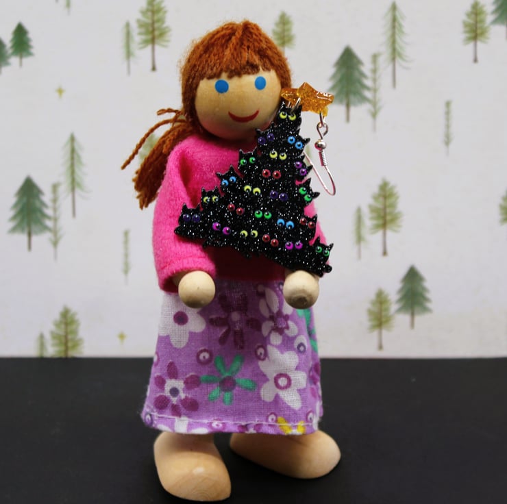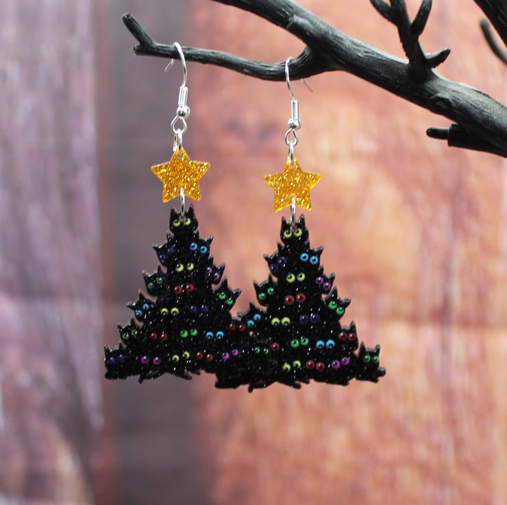 Black Christmas Tree Earrings with Rainbow Cat Eyes and Glitter Stars