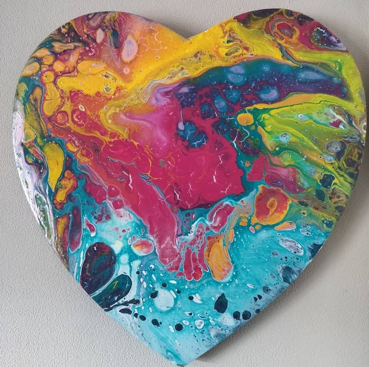 A vibrant explosion of colour, this heart-shaped acrylic pour artwork is full of movement, depth, and energy . With swirls of turquoise, pink, yellow, and green, each detail tells its own story, making it a stunning focal point for any room.