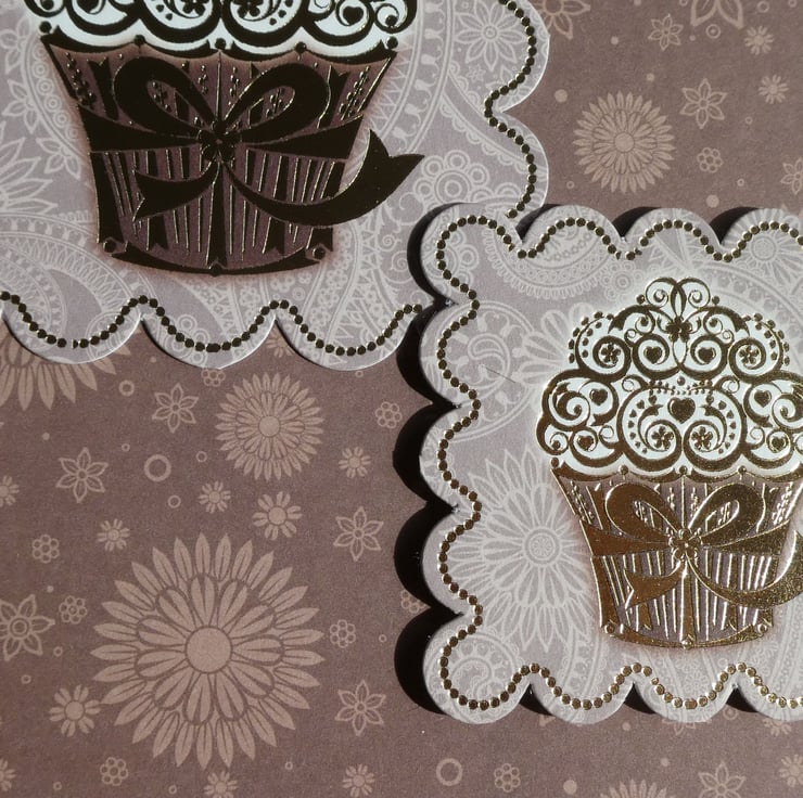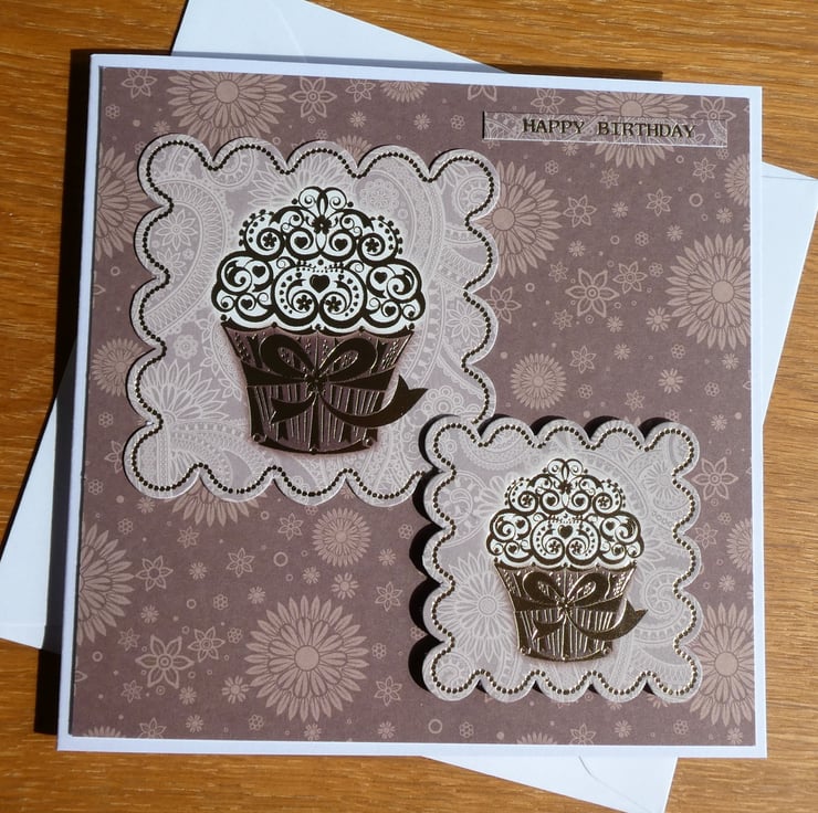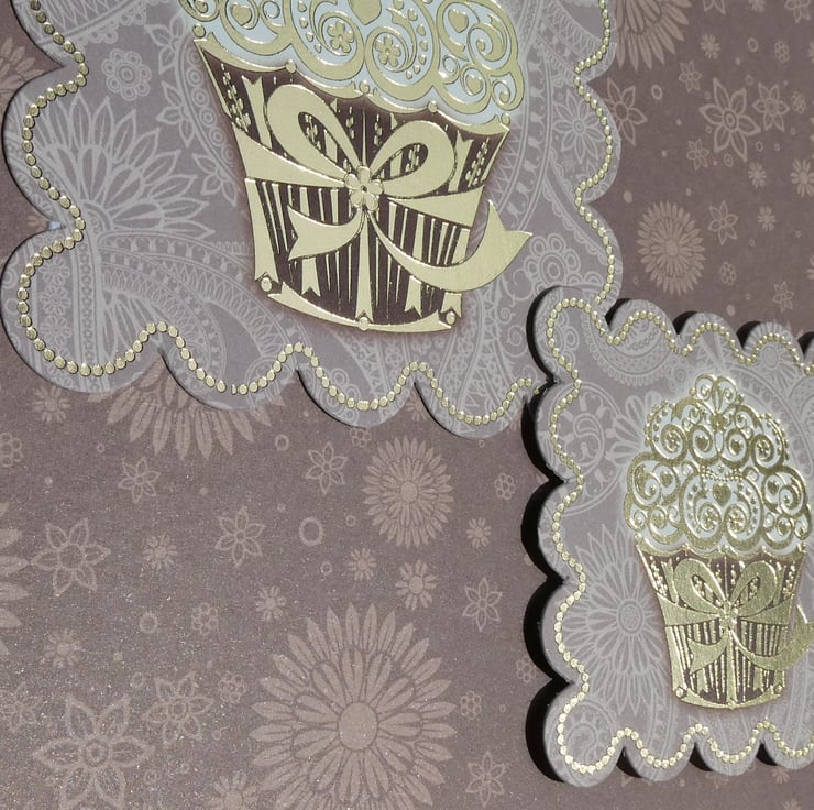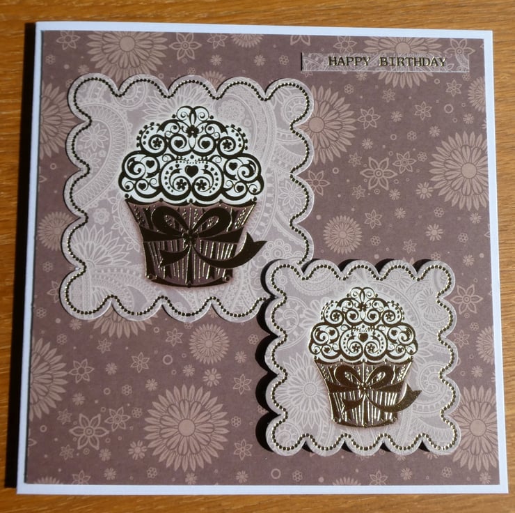 Two square, scallop edged images of cupcakes with elaborate cream icing and gold foiled details have been mounted on foam pads above background card printed with an abstract floral design in pale brown shades. The message Happy Birthday in gold foil has been added in the top right corner.