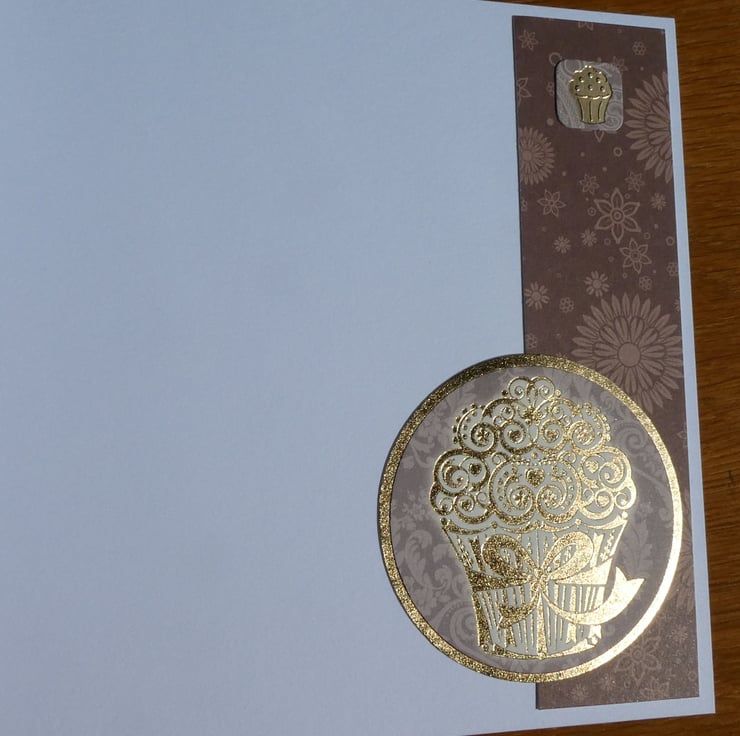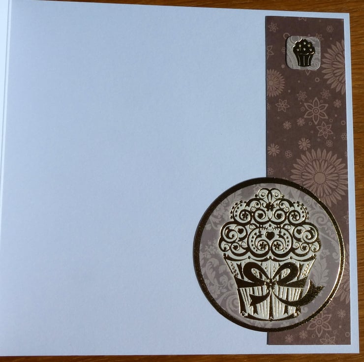 With 2 cupcakes on the front and another 2 inside this birthday card in shades of coffee, chocolate and gold would be ideal to send to someone who loves to bake, or just likes cake!