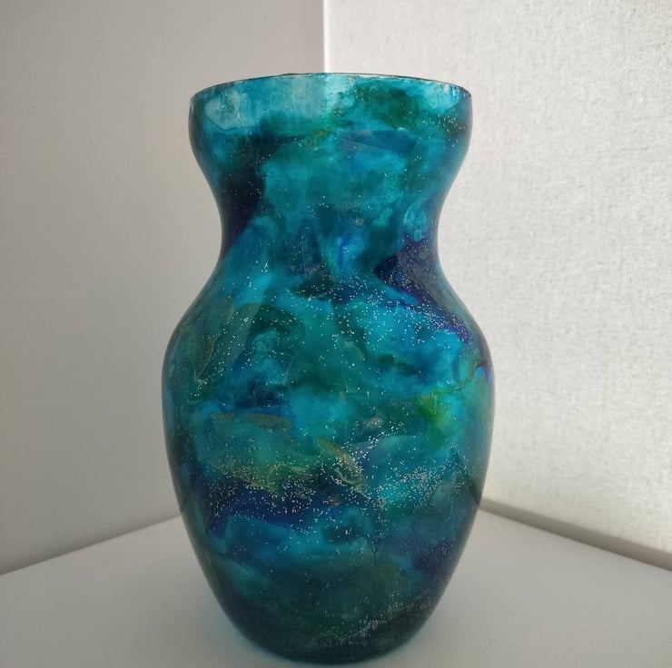 This stunning vase is hand-poured in rich teal-blue tones with hints of shimmer that catch the light beautifully. Solid, durable, and full of character, it’s perfect for showcasing flowers or as a striking standalone piece.