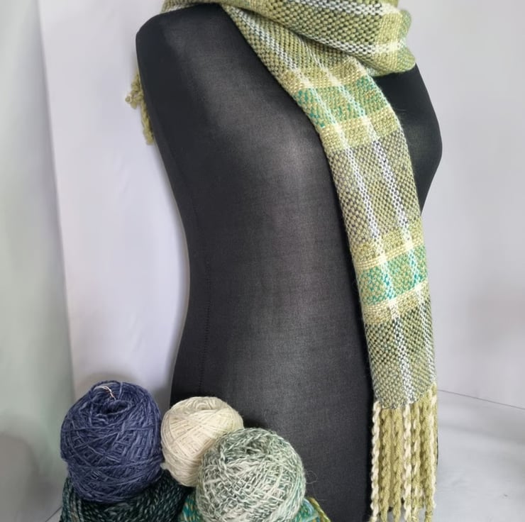 A lovely length that can be wrapped around double and draped, and it's hand twisted tassels are a visual pleasure. I have added a picture of the the coloured yarns used to make it .