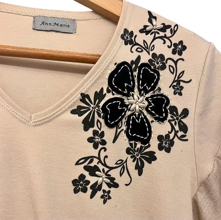 -Multi-media detailing with black overlay petals, embroidery, and beadwork