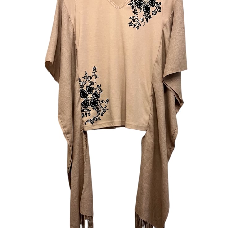 -Flowing boho sleeves made from a soft beige pashmina scarf