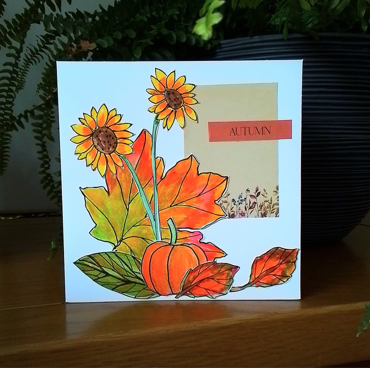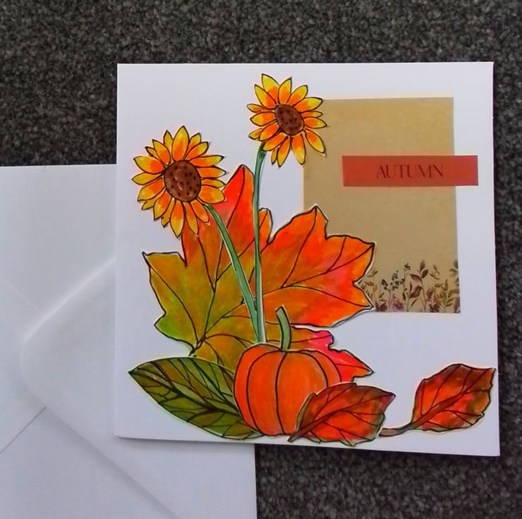Paper collage created by hand painting the leaves sunflowers and pumpkin, cutting them out and gluing to a white card , to create an Autumn inspired picture.