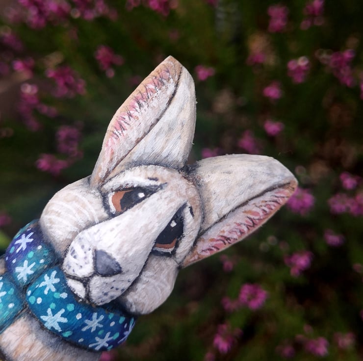 Hand-carved from basswood using a single small knife, Sully was then gently sanded and painted with watercolours and acrylics to bring out his expressive features and snowy scarf. He’s sealed with Danish oil for a soft, lasting finish. Every detail—from his squishy nose to his cheeky slogans—was crafted with care and imagination.